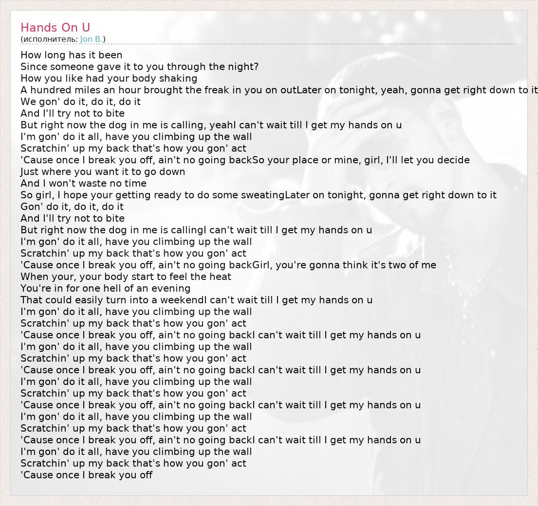 How long has it been Since someone gave it to you through the night? How you like had your body shaking A hundred miles an hour brought the freak in you on outLater on tonight, yeah, gonna get right down to it We gon' do it, do it, do it And I'll try not to bite But right now the dog in me is calling, yeahI can't wait till I get my hands on u I'm gon' do it all, have you climbing up the wall Scratchin' up my back that's how you gon' act 'Cause once I break you off, ain't no going backSo your place or mine, girl, I'll let you decide Just where you want it to go down And I won't waste no time So girl, I hope your getting ready to do some sweatingLater on tonight, gonna get right down to it Gon' do it, do it, do it And I'll try not to bite But right now the dog in me is callingI can't wait till I get my hands on u I'm gon' do it all, have you climbing up the wall Scratchin' up my back that's how you gon' act 'Cause once I break you off, ain't no going backGirl, you're gonna think it's two of me When your, your body start to feel the heat You're in for one hell of an evening That could easily turn into a weekendI can't wait till I get my hands on u I'm gon' do it all, have you climbing up the wall Scratchin' up my back that's how you gon' act 'Cause once I break you off, ain't no going backI can't wait till I get my hands on u I'm gon' do it all, have you climbing up the wall Scratchin' up my back that's how you gon' act 'Cause once I break you off, ain't no going backI can't wait till I get my hands on u I'm gon' do it all, have you climbing up the wall Scratchin' up my back that's how you gon' act 'Cause once I break you off, ain't no going backI can't wait till I get my hands on u I'm gon' do it all, have you climbing up the wall Scratchin' up my back that's how you gon' act 'Cause once I break you off, ain't no going backI can't wait till I get my hands on u I'm gon' do it all, have you climbing up the wall Scratchin' up my back that's how you gon' act 'Cause once I break you off