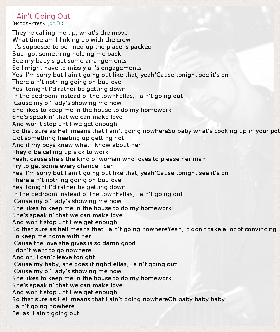 They're calling me up, what's the move What time am I linking up with the crew It's supposed to be lined up the place is packed But I got something holding me back See my baby's got some arrangements So I might have to miss y'all's engagements Yes, I'm sorry but I ain't going out like that, yeah'Cause tonight see it's on There ain't nothing going on but love Yes, tonight I'd rather be getting down In the bedroom instead of the townFellas, I ain't going out 'Cause my ol' lady's showing me how She likes to keep me in the house to do my homework She's speakin' that we can make love And won't stop until we get enough So that sure as Hell means that I ain't going nowhereSo baby what's cooking up in your pot Got something heating up getting hot And if my boys knew what I know about her They'd be calling up sick to work Yeah, cause she's the kind of woman who loves to please her man Try to get some every chance I can Yes, I'm sorry but I ain't going out like that, yeah'Cause tonight see it's on There ain't nothing going on but love Yes, tonight I'd rather be getting down In the bedroom instead of the townFellas, I ain't going out 'Cause my ol' lady's showing me how She likes to keep me in the house to do my homework She's speakin' that we can make love And won't stop until we get enough So that sure as hell means that I ain't going nowhereYeah, it don't take a lot of convincing To keep me home with her 'Cause the love she gives is so damn good I don't want to go nowhere And oh, I can't leave tonight 'Cause my baby, she does it rightFellas, I ain't going out 'Cause my ol' lady's showing me how She likes to keep me in the house to do my homework She's speakin' that we can make love And won't stop until we get enough So that sure as Hell means that I ain't going nowhereOh baby baby baby I ain't going nowhere Fellas, I ain't going out