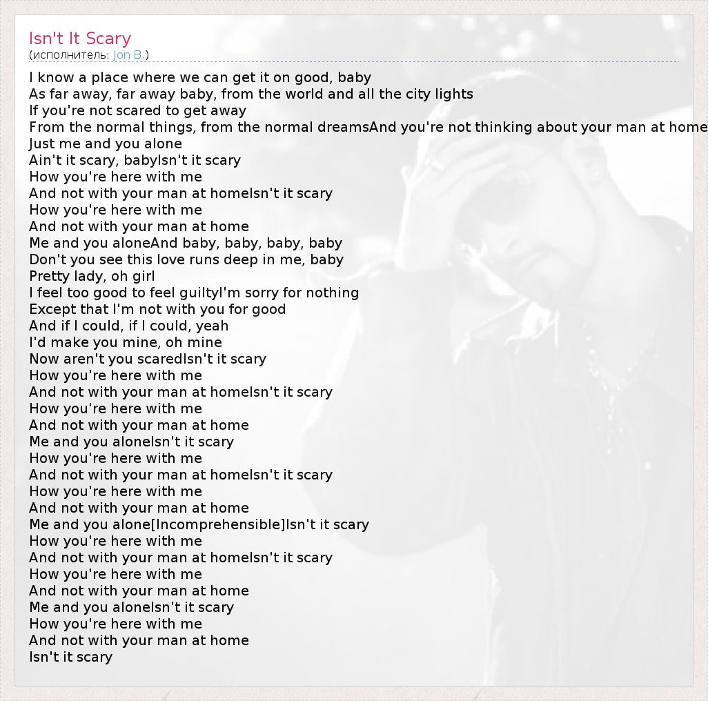 I know a place where we can get it on good, baby As far away, far away baby, from the world and all the city lights If you're not scared to get away From the normal things, from the normal dreamsAnd you're not thinking about your man at home Just me and you alone Ain't it scary, babyIsn't it scary How you're here with me And not with your man at homeIsn't it scary How you're here with me And not with your man at home Me and you aloneAnd baby, baby, baby, baby Don't you see this love runs deep in me, baby Pretty lady, oh girl I feel too good to feel guiltyI'm sorry for nothing Except that I'm not with you for good And if I could, if I could, yeah I'd make you mine, oh mine Now aren't you scaredIsn't it scary How you're here with me And not with your man at homeIsn't it scary How you're here with me And not with your man at home Me and you aloneIsn't it scary How you're here with me And not with your man at homeIsn't it scary How you're here with me And not with your man at home Me and you alone[Incomprehensible]Isn't it scary How you're here with me And not with your man at homeIsn't it scary How you're here with me And not with your man at home Me and you aloneIsn't it scary How you're here with me And not with your man at home Isn't it scary