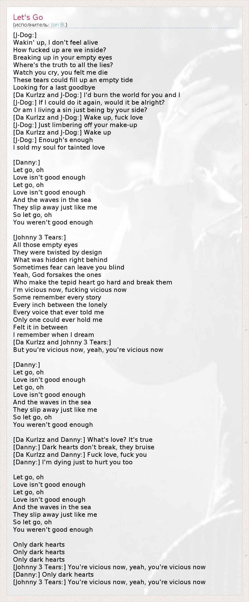 [J-Dog:] Wakin' up, I don't feel alive How fucked up are we inside? Breaking up in your empty eyes Where's the truth to all the lies? Watch you cry, you felt me die These tears could fill up an empty tide Looking for a last goodbye [Da Kurlzz and J-Dog:] I'd burn the world for you and I [J-Dog:] If I could do it again, would it be alright? Or am I living a sin just being by your side? [Da Kurlzz and J-Dog:] Wake up, fuck love [J-Dog:] Just limbering off your make-up [Da Kurlzz and J-Dog:] Wake up [J-Dog:] Enough's enough I sold my soul for tainted love [Danny:] Let go, oh Love isn't good enough Let go, oh Love isn't good enough And the waves in the sea They slip away just like me So let go, oh You weren't good enough [Johnny 3 Tears:] All those empty eyes They were twisted by design What was hidden right behind Sometimes fear can leave you blind Yeah, God forsakes the ones Who make the tepid heart go hard and break them I'm vicious now, fucking vicious now Some remember every story Every inch between the lonely Every voice that ever told me Only one could ever hold me Felt it in between I remember when I dream [Da Kurlzz and Johnny 3 Tears:] But you're vicious now, yeah, you're vicious now [Danny:] Let go, oh Love isn't good enough Let go, oh Love isn't good enough And the waves in the sea They slip away just like me So let go, oh You weren't good enough [Da Kurlzz and Danny:] What's love? It's true [Danny:] Dark hearts don't break, they bruise [Da Kurlzz and Danny:] Fuck love, fuck you [Danny:] I'm dying just to hurt you too Let go, oh Love isn't good enough Let go, oh Love isn't good enough And the waves in the sea They slip away just like me So let go, oh You weren't good enough Only dark hearts Only dark hearts Only dark hearts [Johnny 3 Tears:] You're vicious now, yeah, you're vicious now [Danny:] Only dark hearts [Johnny 3 Tears:] You're vicious now, yeah, you're vicious now