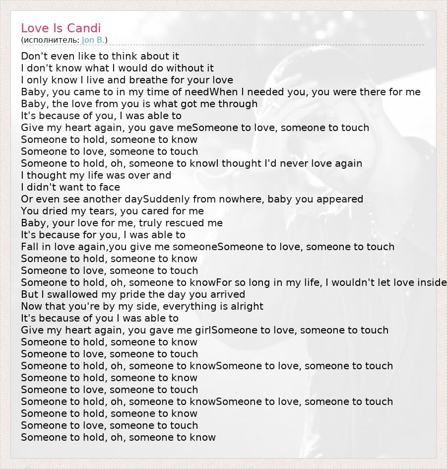 Don't even like to think about it I don't know what I would do without it I only know I live and breathe for your love Baby, you came to in my time of needWhen I needed you, you were there for me Baby, the love from you is what got me through It's because of you, I was able to Give my heart again, you gave meSomeone to love, someone to touch Someone to hold, someone to know Someone to love, someone to touch Someone to hold, oh, someone to knowI thought I'd never love again I thought my life was over and I didn't want to face Or even see another daySuddenly from nowhere, baby you appeared You dried my tears, you cared for me Baby, your love for me, truly rescued me It's because for you, I was able to Fall in love again,you give me someoneSomeone to love, someone to touch Someone to hold, someone to know Someone to love, someone to touch Someone to hold, oh, someone to knowFor so long in my life, I wouldn't let love inside But I swallowed my pride the day you arrived Now that you're by my side, everything is alright It's because of you I was able to Give my heart again, you gave me girlSomeone to love, someone to touch Someone to hold, someone to know Someone to love, someone to touch Someone to hold, oh, someone to knowSomeone to love, someone to touch Someone to hold, someone to know Someone to love, someone to touch Someone to hold, oh, someone to knowSomeone to love, someone to touch Someone to hold, someone to know Someone to love, someone to touch Someone to hold, oh, someone to know
