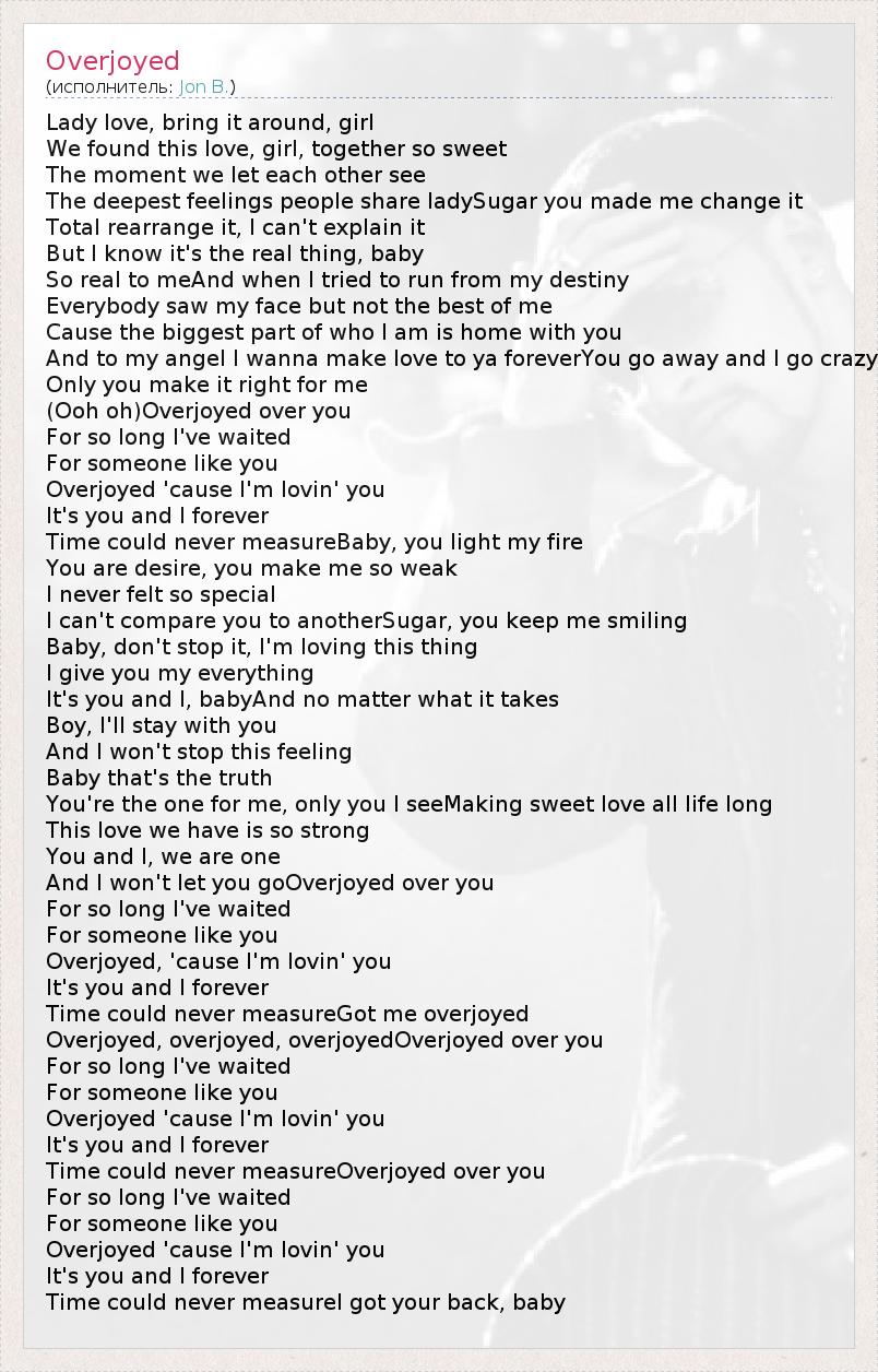 Lady love, bring it around, girl We found this love, girl, together so sweet The moment we let each other see The deepest feelings people share ladySugar you made me change it Total rearrange it, I can't explain it But I know it's the real thing, baby So real to meAnd when I tried to run from my destiny Everybody saw my face but not the best of me Cause the biggest part of who I am is home with you And to my angel I wanna make love to ya foreverYou go away and I go crazy Only you make it right for me (Ooh oh)Overjoyed over you For so long I've waited For someone like you Overjoyed 'cause I'm lovin' you It's you and I forever Time could never measureBaby, you light my fire You are desire, you make me so weak I never felt so special I can't compare you to anotherSugar, you keep me smiling Baby, don't stop it, I'm loving this thing I give you my everything It's you and I, babyAnd no matter what it takes Boy, I'll stay with you And I won't stop this feeling Baby that's the truth You're the one for me, only you I seeMaking sweet love all life long This love we have is so strong You and I, we are one And I won't let you goOverjoyed over you For so long I've waited For someone like you Overjoyed, 'cause I'm lovin' you It's you and I forever Time could never measureGot me overjoyed Overjoyed, overjoyed, overjoyedOverjoyed over you For so long I've waited For someone like you Overjoyed 'cause I'm lovin' you It's you and I forever Time could never measureOverjoyed over you For so long I've waited For someone like you Overjoyed 'cause I'm lovin' you It's you and I forever Time could never measureI got your back, baby