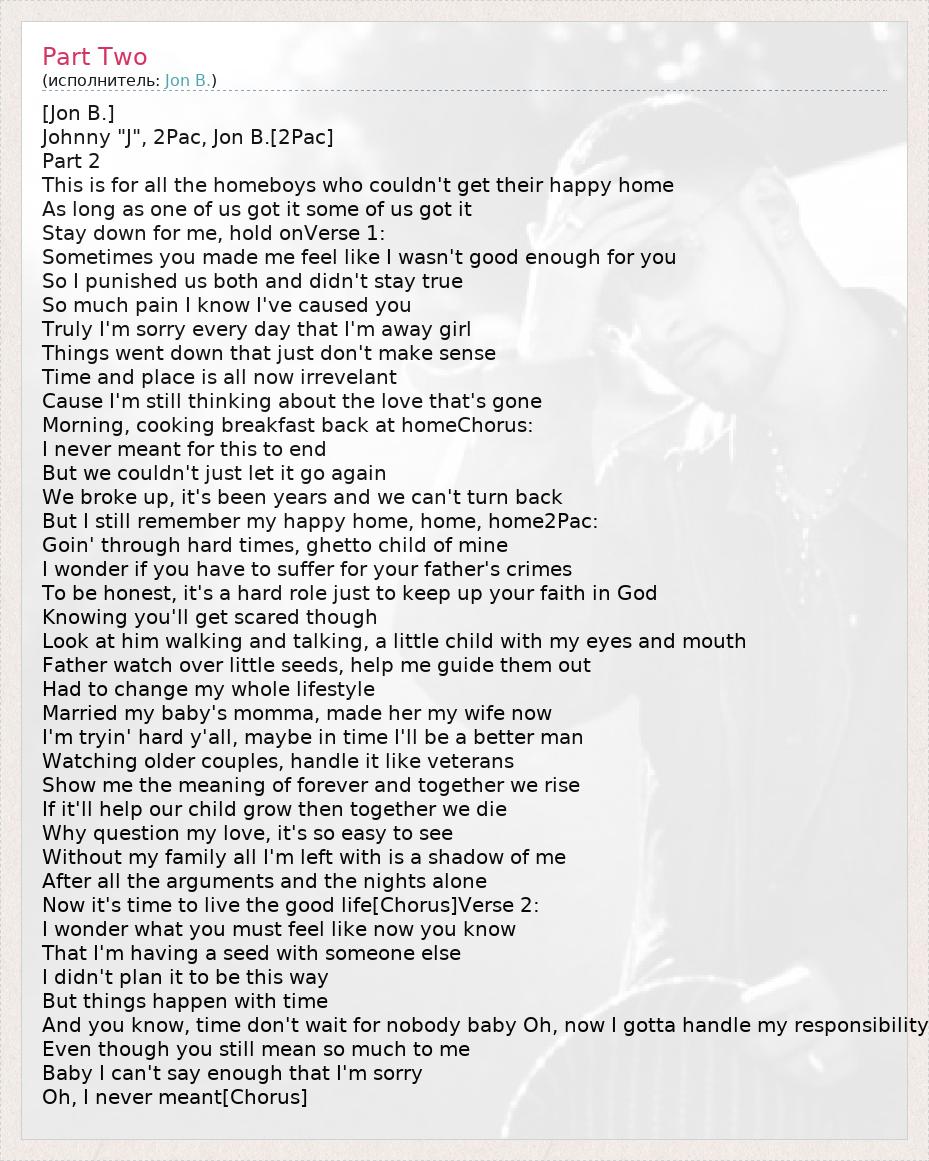 [Jon B.] Johnny "J", 2Pac, Jon B.[2Pac] Part 2 This is for all the homeboys who couldn't get their happy home As long as one of us got it some of us got it Stay down for me, hold onVerse 1: Sometimes you made me feel like I wasn't good enough for you So I punished us both and didn't stay true So much pain I know I've caused you Truly I'm sorry every day that I'm away girl Things went down that just don't make sense Time and place is all now irrevelant Cause I'm still thinking about the love that's gone Morning, cooking breakfast back at homeChorus: I never meant for this to end But we couldn't just let it go again We broke up, it's been years and we can't turn back But I still remember my happy home, home, home2Pac: Goin' through hard times, ghetto child of mine I wonder if you have to suffer for your father's crimes To be honest, it's a hard role just to keep up your faith in God Knowing you'll get scared though Look at him walking and talking, a little child with my eyes and mouth Father watch over little seeds, help me guide them out Had to change my whole lifestyle Married my baby's momma, made her my wife now I'm tryin' hard y'all, maybe in time I'll be a better man Watching older couples, handle it like veterans Show me the meaning of forever and together we rise If it'll help our child grow then together we die Why question my love, it's so easy to see Without my family all I'm left with is a shadow of me After all the arguments and the nights alone Now it's time to live the good life[Chorus]Verse 2: I wonder what you must feel like now you know That I'm having a seed with someone else I didn't plan it to be this way But things happen with time And you know, time don't wait for nobody baby Oh, now I gotta handle my responsibility Even though you still mean so much to me Baby I can't say enough that I'm sorry Oh, I never meant[Chorus]