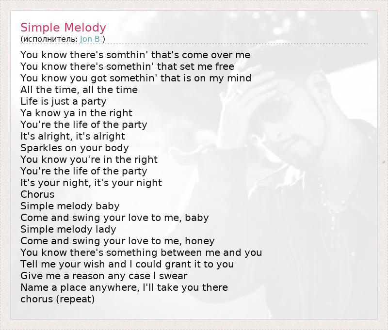 You know there's somthin' that's come over me You know there's somethin' that set me free You know you got somethin' that is on my mind All the time, all the time Life is just a party Ya know ya in the right You're the life of the party It's alright, it's alright Sparkles on your body You know you're in the right You're the life of the party It's your night, it's your night Chorus Simple melody baby Come and swing your love to me, baby Simple melody lady Come and swing your love to me, honey You know there's something between me and you Tell me your wish and I could grant it to you Give me a reason any case I swear Name a place anywhere, I'll take you there chorus (repeat)