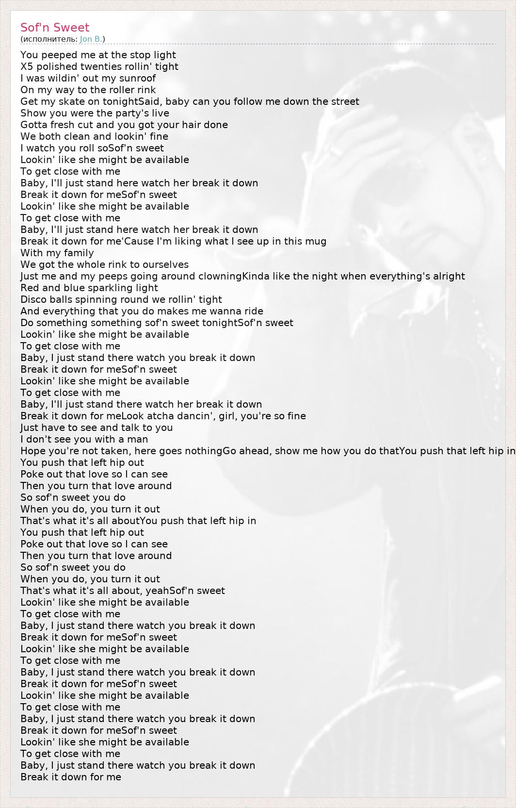 You peeped me at the stop light X5 polished twenties rollin' tight I was wildin' out my sunroof On my way to the roller rink Get my skate on tonightSaid, baby can you follow me down the street Show you were the party's live Gotta fresh cut and you got your hair done We both clean and lookin' fine I watch you roll soSof'n sweet Lookin' like she might be available To get close with me Baby, I'll just stand here watch her break it down Break it down for meSof'n sweet Lookin' like she might be available To get close with me Baby, I'll just stand here watch her break it down Break it down for me'Cause I'm liking what I see up in this mug With my family We got the whole rink to ourselves Just me and my peeps going around clowningKinda like the night when everything's alright Red and blue sparkling light Disco balls spinning round we rollin' tight And everything that you do makes me wanna ride Do something something sof'n sweet tonightSof'n sweet Lookin' like she might be available To get close with me Baby, I just stand there watch you break it down Break it down for meSof'n sweet Lookin' like she might be available To get close with me Baby, I'll just stand there watch her break it down Break it down for meLook atcha dancin', girl, you're so fine Just have to see and talk to you I don't see you with a man Hope you're not taken, here goes nothingGo ahead, show me how you do thatYou push that left hip in You push that left hip out Poke out that love so I can see Then you turn that love around So sof'n sweet you do When you do, you turn it out That's what it's all aboutYou push that left hip in You push that left hip out Poke out that love so I can see Then you turn that love around So sof'n sweet you do When you do, you turn it out That's what it's all about, yeahSof'n sweet Lookin' like she might be available To get close with me Baby, I just stand there watch you break it down Break it down for meSof'n sweet Lookin' like she might be available To get close with me Baby, I just stand there watch you break it down Break it down for meSof'n sweet Lookin' like she might be available To get close with me Baby, I just stand there watch you break it down Break it down for meSof'n sweet Lookin' like she might be available To get close with me Baby, I just stand there watch you break it down Break it down for me