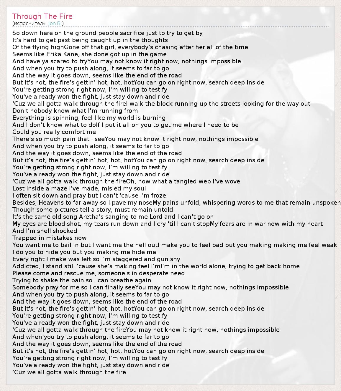 So down here on the ground people sacrifice just to try to get by It's hard to get past being caught up in the thoughts Of the flying highGone off that girl, everybody's chasing after her all of the time Seems like Erika Kane, she done got up in the game And have ya scared to tryYou may not know it right now, nothings impossible And when you try to push along, it seems to far to go And the way it goes down, seems like the end of the road But it's not, the fire's gettin' hot, hot, hotYou can go on right now, search deep inside You're getting strong right now, I'm willing to testify You've already won the fight, just stay down and ride 'Cuz we all gotta walk through the fireI walk the block running up the streets looking for the way out Don't nobody know what I'm running from Everything is spinning, feel like my world is burning And I don't know what to doIf I put it all on you to get me where I need to be Could you really comfort me There's so much pain that I seeYou may not know it right now, nothings impossible And when you try to push along, it seems to far to go And the way it goes down, seems like the end of the road But it's not, the fire's gettin' hot, hot, hotYou can go on right now, search deep inside You're getting strong right now, I'm willing to testify You've already won the fight, just stay down and ride 'Cuz we all gotta walk through the fireOh, now what a tangled web I've wove Lost inside a maze I've made, misled my soul I often sit down and pray but I can't 'cause I'm froze Besides, Heavens to far away so I pave my noseMy pains unfold, whispering words to me that remain unspoken Though some pictures tell a story, must remain untold It's the same old song Aretha's sanging to me Lord and I can't go on My eyes are blood shot, my tears run down and I cry 'til I can't stopMy fears are in war now with my heart And I'm shell shocked Trapped in mistakes now You want me to bail in but I want me the hell outI make you to feel bad but you making making me feel weak I do you to hide you but you making me hide me Every right I make was left so I'm staggered and gun shy Addicted, I stand still 'cause she's making feel I'mI'm in the world alone, trying to get back home Please come and rescue me, someone's in desperate need Trying to shake the pain so I can breathe again Somebody pray for me so I can finally seeYou may not know it right now, nothings impossible And when you try to push along, it seems to far to go And the way it goes down, seems like the end of the road But it's not, the fire's gettin' hot, hot, hotYou can go on right now, search deep inside You're getting strong right now, I'm willing to testify You've already won the fight, just stay down and ride 'Cuz we all gotta walk through the fireYou may not know it right now, nothings impossible And when you try to push along, it seems to far to go And the way it goes down, seems like the end of the road But it's not, the fire's gettin' hot, hot, hotYou can go on right now, search deep inside You're getting strong right now, I'm willing to testify You've already won the fight, just stay down and ride 'Cuz we all gotta walk through the fire
