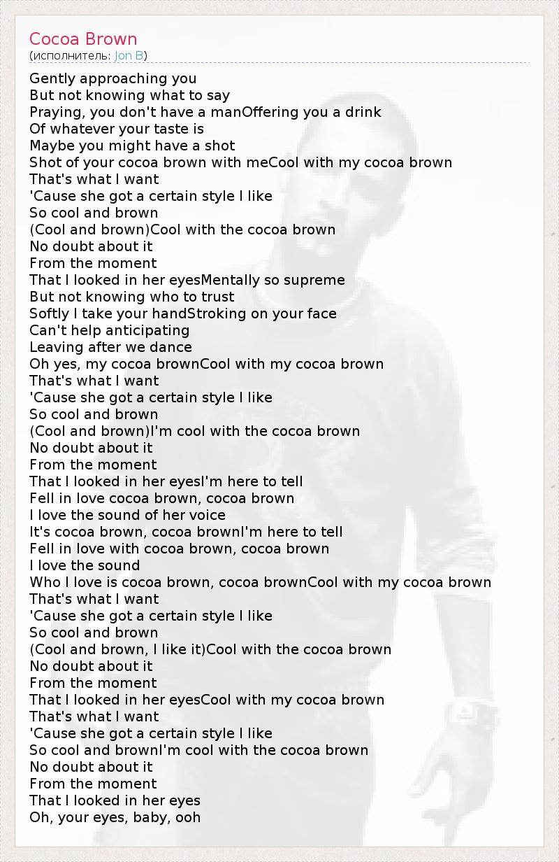 Gently approaching you But not knowing what to say Praying, you don't have a manOffering you a drink Of whatever your taste is Maybe you might have a shot Shot of your cocoa brown with meCool with my cocoa brown That's what I want 'Cause she got a certain style I like So cool and brown (Cool and brown)Cool with the cocoa brown No doubt about it From the moment That I looked in her eyesMentally so supreme But not knowing who to trust Softly I take your handStroking on your face Can't help anticipating Leaving after we dance Oh yes, my cocoa brownCool with my cocoa brown That's what I want 'Cause she got a certain style I like So cool and brown (Cool and brown)I'm cool with the cocoa brown No doubt about it From the moment That I looked in her eyesI'm here to tell Fell in love cocoa brown, cocoa brown I love the sound of her voice It's cocoa brown, cocoa brownI'm here to tell Fell in love with cocoa brown, cocoa brown I love the sound Who I love is cocoa brown, cocoa brownCool with my cocoa brown That's what I want 'Cause she got a certain style I like So cool and brown (Cool and brown, I like it)Cool with the cocoa brown No doubt about it From the moment That I looked in her eyesCool with my cocoa brown That's what I want 'Cause she got a certain style I like So cool and brownI'm cool with the cocoa brown No doubt about it From the moment That I looked in her eyes Oh, your eyes, baby, ooh