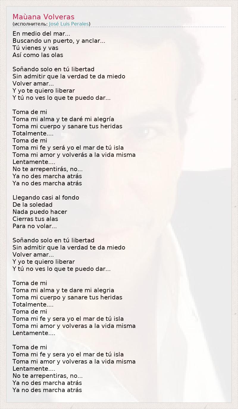 Посреди моря... Ты ищешь порт и бросаешь якорь... Ты приходишь и уходишь, Так же, как и волны Мечтая только о своей свободе, Ты не признаешь, что правда боишься Вновь любить... И я хочу освободить тебя, А ты не видишь того, что я могу дать тебе... Возьми у меня, Возьми мою душу, и я отдам тебе свою радость, Возьми мое тело, и я вылечу твои раны Полностью.... Возьми у меня, Возьми мою веру, и буду я морем для твоего острова Возьми мою любовь, и ты вернешься к прежней жизни Медленно.... Ты не пожалеешь, нет... Не отступай, Не давай задний ход. Почти достигнув дна Одиночества, Я ничего не могу поделать, Ты складываешь свои крылья, Чтобы не летать... Мечтая только о своей свободе, Ты не признаешь, что правда боишься Вновь любить... И я хочу освободить тебя, А ты не видишь того, что я могу дать тебе... Возьми у меня, Возьми мою душу, и я отдам тебе свою радость, Возьми мое тело, и я исцелю твои раны Полностью.... Возьми у меня, Возьми мою веру, и я стану морем для твоего острова, Возьми мою любовь, и ты вернешься к прежней жизни Медленно.... Возьми у меня, Возьми мою веру, и я стану морем для твоего острова, Возьми мою любовь, и ты вернешься к прежней жизни Медленно.... Ты не пожалеешь, нет... Не отступай, Не давай задний ход...