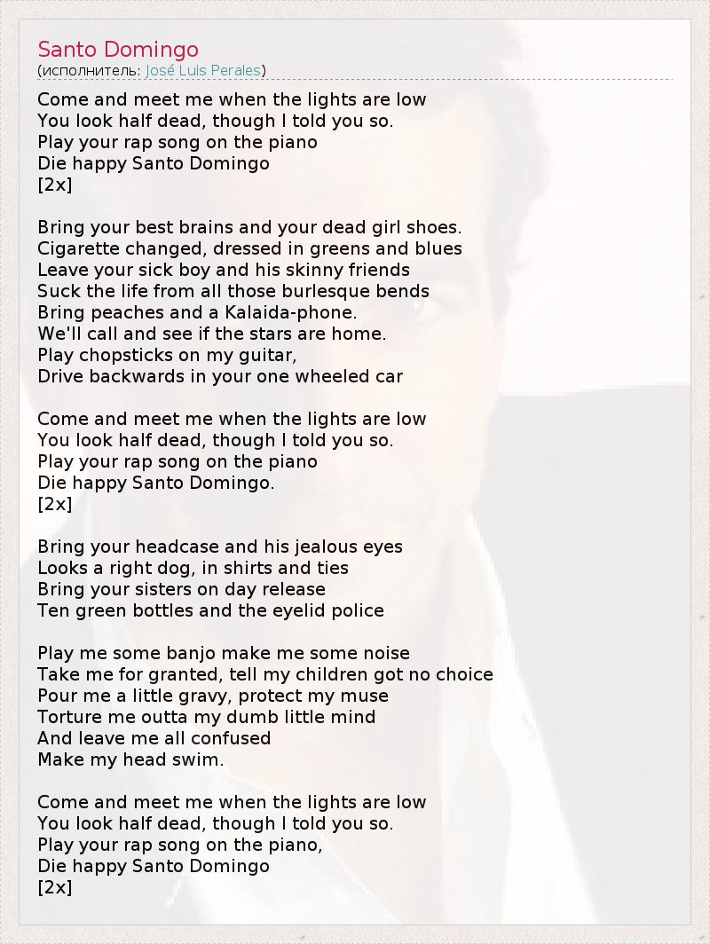 Давай встретимся, когда совсем стемнеет? Очень плохо выглядишь – а я ведь говорил, что так и будет! Играй свой рэп на пианино И умрешь счастливой в Санто-Доминго. [2x] Позови своих друзей-умников и прихвати туфли той девчонки, которая умерла, Возьми новые сигареты, надень что-нибудь эдакое, Забей на своего чахлого парня и его тощих друзей – Сделай, наконец, что-нибудь неожиданное, ведь это и есть настоящая жизнь! Принеси еще персиков и телефон с выходом в Интернет: Позвоним звездам, узнаем, все ли дома, Будем играть на гитаре палочками для еды И кататься задом наперед в твоей одноколесной машине. Давай встретимся, когда совсем стемнеет? Очень плохо выглядишь – а я ведь говорил, что так и будет! Играй свой рэп на пианино И умрешь счастливой в Санто-Доминго. [2x] Оторвемся по полной – и пусть он с ума сойдет от ревности, Весь такой правильный: рубашка, галстук... Приводи своих подружек – сегодня у нас выходной: Напьемся – а потом нас накроет сон. Сыграй мне на банджо, давай пошумим, Доверься мне, детям потом скажешь, что у тебя не было выбора. Сделай мою жизнь менее пресной, только позаботься потом о моей музе, Сведи меня с ума, сделай так, чтобы Я перестал понимать, что происходит. Пусть моя голова пойдет кругом... Давай встретимся, когда совсем стемнеет? Очень плохо выглядишь – а я ведь говорил, что так и будет! Играй свой рэп на пианино И умрешь счастливой в Санто-Доминго. [2x]