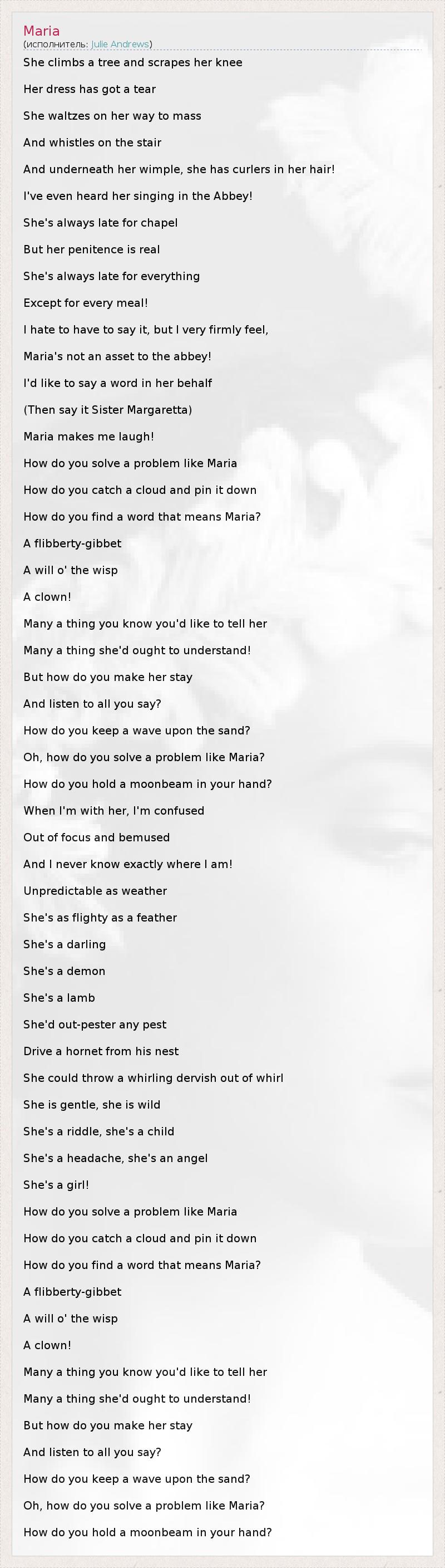 She climbs a tree and scrapes her knee Her dress has got a tear She waltzes on her way to mass And whistles on the stair And underneath her wimple, she has curlers in her hair! I've even heard her singing in the Abbey! She's always late for chapel But her penitence is real She's always late for everything Except for every meal! I hate to have to say it, but I very firmly feel, Maria's not an asset to the abbey! I'd like to say a word in her behalf (Then say it Sister Margaretta) Maria makes me laugh! How do you solve a problem like Maria How do you catch a cloud and pin it down How do you find a word that means Maria? A flibberty-gibbet A will o' the wisp A clown! Many a thing you know you'd like to tell her Many a thing she'd ought to understand! But how do you make her stay And listen to all you say? How do you keep a wave upon the sand? Oh, how do you solve a problem like Maria? How do you hold a moonbeam in your hand? When I'm with her, I'm confused Out of focus and bemused And I never know exactly where I am! Unpredictable as weather She's as flighty as a feather She's a darling She's a demon She's a lamb She'd out-pester any pest Drive a hornet from his nest She could throw a whirling dervish out of whirl She is gentle, she is wild She's a riddle, she's a child She's a headache, she's an angel She's a girl! How do you solve a problem like Maria How do you catch a cloud and pin it down How do you find a word that means Maria? A flibberty-gibbet A will o' the wisp A clown! Many a thing you know you'd like to tell her Many a thing she'd ought to understand! But how do you make her stay And listen to all you say? How do you keep a wave upon the sand? Oh, how do you solve a problem like Maria? How do you hold a moonbeam in your hand?