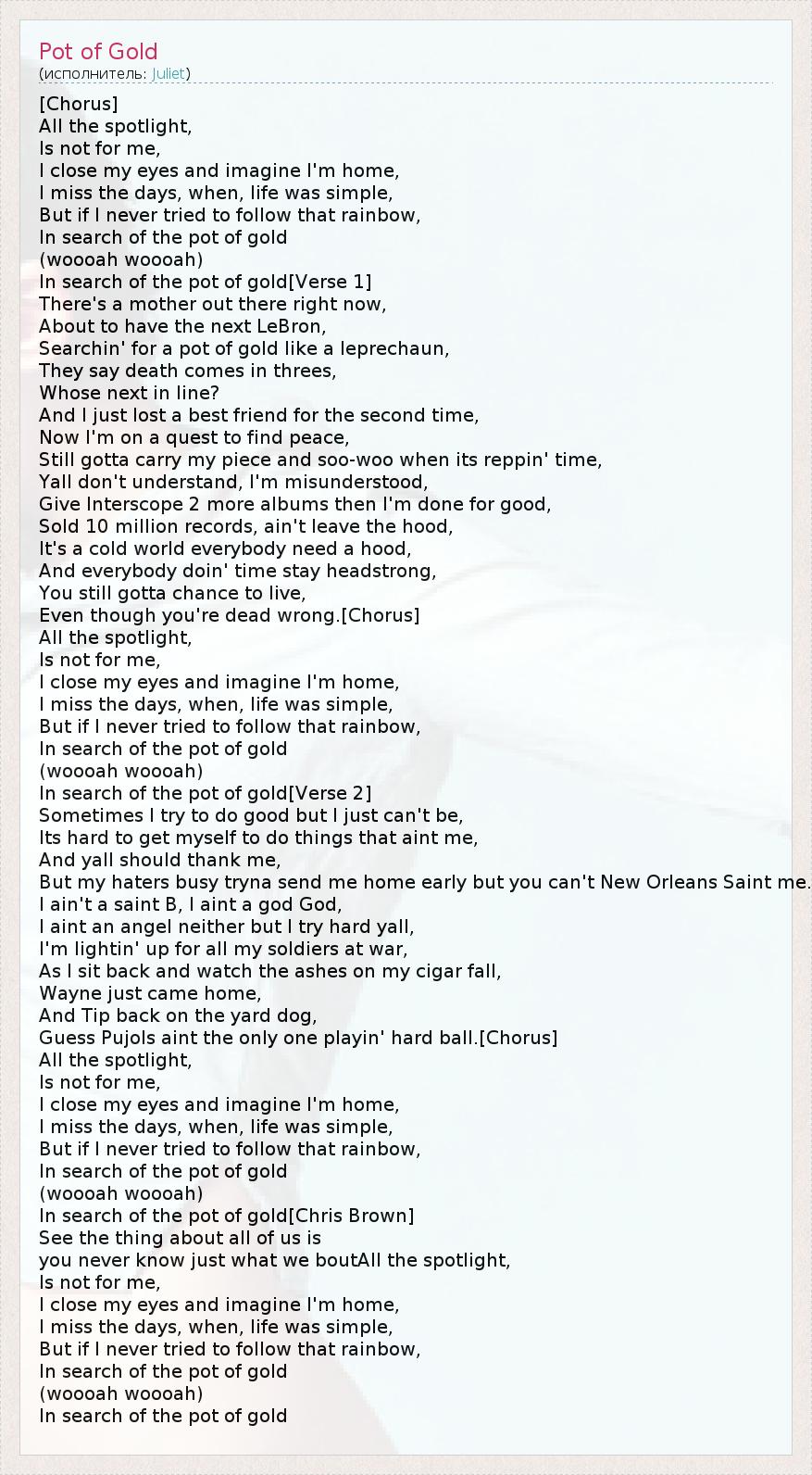 [Chorus] All the spotlight, Is not for me, I close my eyes and imagine I'm home, I miss the days, when, life was simple, But if I never tried to follow that rainbow, In search of the pot of gold (woooah woooah) In search of the pot of gold[Verse 1] There's a mother out there right now, About to have the next LeBron, Searchin' for a pot of gold like a leprechaun, They say death comes in threes, Whose next in line? And I just lost a best friend for the second time, Now I'm on a quest to find peace, Still gotta carry my piece and soo-woo when its reppin' time, Yall don't understand, I'm misunderstood, Give Interscope 2 more albums then I'm done for good, Sold 10 million records, ain't leave the hood, It's a cold world everybody need a hood, And everybody doin' time stay headstrong, You still gotta chance to live, Even though you're dead wrong.[Chorus] All the spotlight, Is not for me, I close my eyes and imagine I'm home, I miss the days, when, life was simple, But if I never tried to follow that rainbow, In search of the pot of gold (woooah woooah) In search of the pot of gold[Verse 2] Sometimes I try to do good but I just can't be, Its hard to get myself to do things that aint me, And yall should thank me, But my haters busy tryna send me home early but you can't New Orleans Saint me. I ain't a saint B, I aint a god God, I aint an angel neither but I try hard yall, I'm lightin' up for all my soldiers at war, As I sit back and watch the ashes on my cigar fall, Wayne just came home, And Tip back on the yard dog, Guess Pujols aint the only one playin' hard ball.[Chorus] All the spotlight, Is not for me, I close my eyes and imagine I'm home, I miss the days, when, life was simple, But if I never tried to follow that rainbow, In search of the pot of gold (woooah woooah) In search of the pot of gold[Chris Brown] See the thing about all of us is you never know just what we boutAll the spotlight, Is not for me, I close my eyes and imagine I'm home, I miss the days, when, life was simple, But if I never tried to follow that rainbow, In search of the pot of gold (woooah woooah) In search of the pot of gold