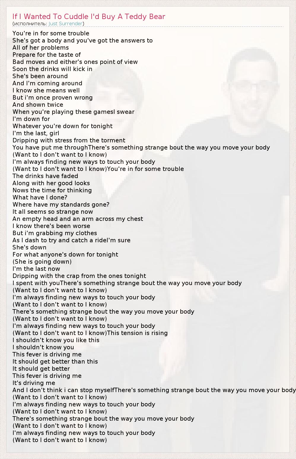 ГлавнаяИсполнителиJust SurrenderIf I Wanted To Cuddle I'd Buy A Teddy Bear