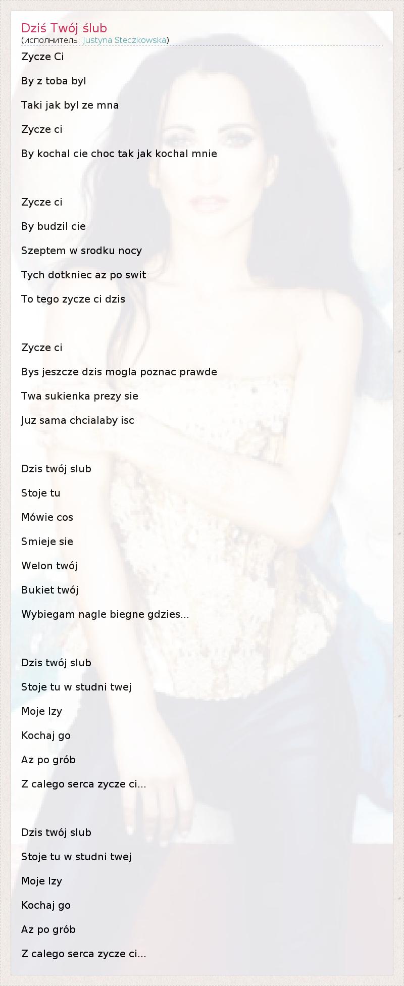 Zycze Ci By z toba byl Taki jak byl ze mna Zycze ci By kochal cie choc tak jak kochal mnie Zycze ci By budzil cie Szeptem w srodku nocy Tych dotkniec az po swit To tego zycze ci dzis Zycze ci Bys jeszcze dzis mogla poznac prawde Twa sukienka prezy sie Juz sama chcialaby isc Dzis twój slub Stoje tu Mówie cos Smieje sie Welon twój Bukiet twój Wybiegam nagle biegne gdzies... Dzis twój slub Stoje tu w studni twej Moje lzy Kochaj go Az po grób Z calego serca zycze ci... Dzis twój slub Stoje tu w studni twej Moje lzy Kochaj go Az po grób Z calego serca zycze ci...