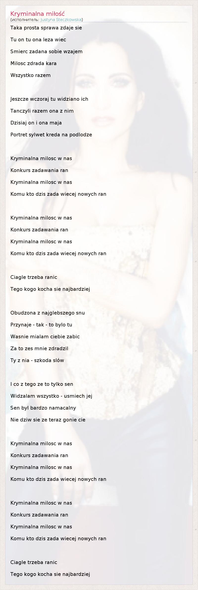 Taka prosta sprawa zdaje sie Tu on tu ona leza wiec Smierc zadana sobie wzajem Milosc zdrada kara Wszystko razem Jeszcze wczoraj tu widziano ich Tanczyli razem ona z nim Dzisiaj on i ona maja Portret sylwet kreda na podlodze Kryminalna milosc w nas Konkurs zadawania ran Kryminalna milosc w nas Komu kto dzis zada wiecej nowych ran Kryminalna milosc w nas Konkurs zadawania ran Kryminalna milosc w nas Komu kto dzis zada wiecej nowych ran Ciagle trzeba ranic Tego kogo kocha sie najbardziej Obudzona z najglebszego snu Przynaje - tak - to bylo tu Wasnie mialam ciebie zabic Za to zes mnie zdradzil Ty z nia - szkoda slów I co z tego ze to tylko sen Widzalam wszystko - usmiech jej Sen byl bardzo namacalny Nie dziw sie ze teraz gonie cie Kryminalna milosc w nas Konkurs zadawania ran Kryminalna milosc w nas Komu kto dzis zada wiecej nowych ran Kryminalna milosc w nas Konkurs zadawania ran Kryminalna milosc w nas Komu kto dzis zada wiecej nowych ran Ciagle trzeba ranic Tego kogo kocha sie najbardziej
