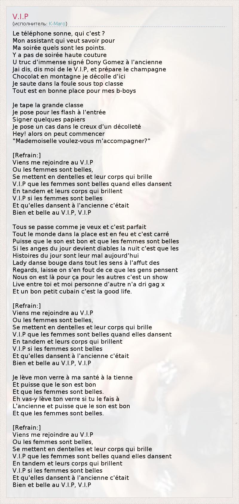 Телефон звонит, кто это? Мой ассистент, который хочет знать Мои планы на вечер. Там в двух шагах какой-то вечер высокой моды С огромной вывеской "Dony Gomez", оформленной под старину. Скажи им, скажи, что я V.I.P, и пусть приготовят шампанское И горы шоколада. Я взлетаю, Я прыгаю в толпу под громкие возгласы, Все по высшему разряду для моих плохих парней. Я покажу мастер-класс, Я позирую для кадра на входе, Подписываю несколько документов, И снова позирую с девушкой с декольте. Хей! тогда можем начать "Мадемуазель, вы хотите меня сопровождать?" [Припев:] Присоединяйся ко мне в V.I.P, Где красивые женщины, Чьи блестящие тела окутаны в кружевные платья. V.I.P, красотки танцуют, Извиваясь своими сверкающими телами V.I.P, даже если они танцуют старомодно, Все равно это прекрасно, Если ты в V.I.P, в V.I.P. Все идет так, как мне хочется, и это прекрасно! Весь мир сегодня зажигает здесь, и это просто круто: Звук - что надо, девушки - великолепны. Днем они ангелы, а ночью - дьяволицы. Здесь их обыденная жизнь становится былью. Девушки, танцуя, пробуждают бурю эмоций своими Безумными взглядами, и им плевать, что подумают парни. А мы здесь как раз для этого: это шоу! Вся жизнь сейчас протекает лишь между тобой и мной, и никого вокруг не существует. Одна кубинская сигара - и жизнь прекрасна. [Припев:] Присоединяйся ко мне в V.I.P, Где красивые женщины, Чьи блестящие тела окутаны в кружевные платья. V.I.P, красотки танцуют, Извиваясь своими сверкающими телами V.I.P, даже если они танцуют старомодно, Все равно это прекрасно, Если ты в V.I.P, в V.I.P. Я поднимаю свой бокал за наше здоровье! И круто, что звук - что надо, И девушки прекрасны. Эй, подними свой бокал, как В старые времена! Ведь так круто, что звук качает И девушки хороши! [Припев:] Присоединяйся ко мне в V.I.P, Где красивые женщины, Чьи блестящие тела окутаны в кружевные платья. V.I.P, красотки танцуют, Извиваясь своими сверкающими телами V.I.P, даже если они танцуют старомодно, Все равно это прекрасно, Если ты в V.I.P, в V.I.P.