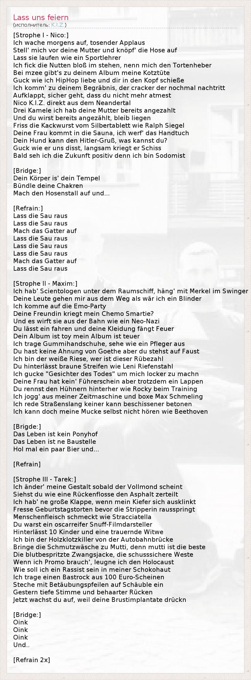 [Strophe I - Nico:] Ich wache morgens auf, tosender Applaus Stell' mich vor deine Mutter und knöpf' die Hose auf Lass sie laufen wie ein Sportlehrer Ich fick die Nutten bloß im stehen, nenn mich den Tortenheber Bei mzee gibt's zu deinem Album meine Kotztüte Guck wie ich HipHop liebe und dir in den Kopf schieße Ich komm' zu deinem Begräbnis, der cracker der nochmal nachtritt Aufklappt, sicher geht, dass du nicht mehr atmest Nico K.I.Z. direkt aus dem Neandertal Drei Kamele ich hab deine Mutter bereits angezahlt Und du wirst bereits angezählt, bleib liegen Friss die Kackwurst vom Silbertablett wie Ralph Siegel Deine Frau kommt in die Sauna, ich werf' das Handtuch Dein Hund kann den Hitler-Gruß, was kannst du? Guck wie er uns disst, langsam kriegt er Schiss Bald seh ich die Zukunft positiv denn ich bin Sodomist [Bridge:] Dein Körper is' dein Tempel Bündle deine Chakren Mach den Hosenstall auf und... [Refrain:] Lass die Sau raus Lass die Sau raus Mach das Gatter auf Lass die Sau raus Lass die Sau raus Lass die Sau raus Mach das Gatter auf Lass die Sau raus [Strophe II - Maxim:] Ich hab' Scientologen unter dem Raumschiff, häng' mit Merkel im Swinger Deine Leute gehen mir aus dem Weg als wär ich ein Blinder Ich komme auf die Emo-Party Deine Freundin kriegt mein Chemo Smartie? Und es wirft sie aus der Bahn wie ein Neo-Nazi Du lässt ein fahren und deine Kleidung fängt Feuer Dein Album ist toy mein Album ist teuer Ich trage Gummihandschuhe, sehe wie ein Pfleger aus Du hast keine Ahnung von Goethe aber du stehst auf Faust Ich bin der weiße Riese, wer ist dieser Rübezahl Du hinterlässt braune Streifen wie Leni Riefenstahl Ich gucke "Gesichter des Todes" um mich locker zu machn Deine Frau hat kein' Führerschein aber trotzdem ein Lappen Du rennst den Hühnern hinterher wie Rocky beim Training Ich jogg' aus meiner Zeitmaschine und boxe Max Schmeling Ich rede Straßenslang keiner kann beschissener betonen Ich kann doch meine Mucke selbst nicht hören wie Beethoven [Brigde:] Das Leben ist kein Ponyhof Das Leben ist ne Baustelle Hol mal ein paar Bier und... [Refrain] [Strophe III - Tarek:] Ich änder' meine Gestalt sobald der Vollmond scheint Siehst du wie eine Rückenflosse den Asphalt zerteilt Ich hab' ne große Klappe, wenn mein Kiefer sich ausklinkt Fresse Geburtstagstorten bevor die Stripperin rausspringt Menschenfleisch schmeckt wie Stracciatella Du warst ein oscarreifer Snuff-Filmdarsteller Hinterlässt 10 Kinder und eine trauernde Witwe Ich bin der Holzklotzkiller von der Autobahnbrücke Bringe die Schmutzwäsche zu Mutti, denn mutti ist die beste Die blutbespritzte Zwangsjacke, die schusssichere Weste Wenn ich Promo brauch', leugne ich den Holocaust Wie soll ich ein Rassist sein in meiner Schokohaut Ich trage einen Bastrock aus 100 Euro-Scheinen Steche mit Betäubungspfeilen auf Schäuble ein Gestern tiefe Stimme und behaarter Rücken Jetzt wachst du auf, weil deine Brustimplantate drückn [Bridge:] Oink Oink Oink Und.. [Refrain 2x]