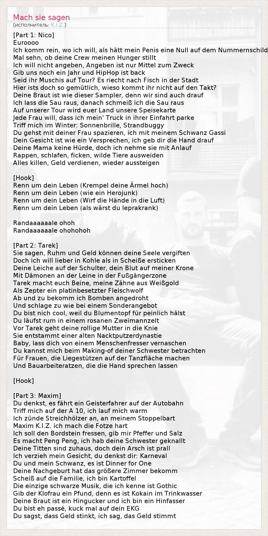 [Part 1: Nico] Euroooo Ich komm rein, wo ich will, als hätt mein Penis eine Null auf dem Nummernschild Mal sehn, ob deine Crew meinen Hunger stillt Ich will nicht angeben, Angeben ist nur Mittel zum Zweck Gib uns noch ein Jahr und HipHop ist back Seid ihr Muschis auf Tour? Es riecht nach Fisch in der Stadt Hier ists doch so gemütlich, wieso kommt ihr nicht auf den Takt? Deine Braut ist wie dieser Sampler, denn wir sind auch drauf Ich lass die Sau raus, danach schmeiß ich die Sau raus Auf unserer Tour wird euer Land unsere Speisekarte Jede Frau will, dass ich mein' Truck in ihrer Einfahrt parke Triff mich im Winter: Sonnenbrille, Strandbuggy Du gehst mit deiner Frau spazieren, ich mit meinem Schwanz Gassi Dein Gesicht ist wie ein Versprechen, ich geb dir die Hand drauf Deine Mama keine Hürde, doch ich nehme sie mit Anlauf Rappen, schlafen, ficken, wilde Tiere ausweiden Alles killen, Geld verdienen, wieder aussteigen [Hook] Renn um dein Leben (Krempel deine Ärmel hoch) Renn um dein Leben (wie ein Herojunk) Renn um dein Leben (Wirf die Hände in die Luft) Renn um dein Leben (als wärst du leprakrank) Randaaaaaale ohoh Randaaaaaale ohohohoh [Part 2: Tarek] Sie sagen, Ruhm und Geld können deine Seele vergiften Doch ich will lieber in Kohle als in Scheiße ersticken Deine Leiche auf der Schulter, dein Blut auf meiner Krone Mit Dämonen an der Leine in der Fußgängerzone Tarek macht euch Beine, meine Zähne aus Weißgold Als Zepter ein platinbesetzter Fleischwolf Ab und zu bekomm ich Bomben angedroht Und schlage zu wie bei einem Sonderangebot Du bist nich cool, weil du Blumentopf für peinlich hälst Du läufst rum in einem rosanen Zweimannzelt Vor Tarek geht deine rollige Mutter in die Knie Sie entstammt einer alten Nacktputzerdynastie Baby, lass dich von einem Menschenfresser vernaschen Du kannst mich beim Making-of deiner Schwester betrachten Für Frauen, die Liegestützen auf der Tanzfläche machen Und Bauarbeiteratzen, die die Hand sprechen lassen [Hook] [Part 3: Maxim] Du denkst, es fährt ein Geisterfahrer auf der Autobahn Triff mich auf der A 10, ich lauf mich warm Ich zünde Streichhölzer an, an meinem Stoppelbart Maxim K.I.Z. ich mach die Fotze hart Ich soll den Bordstein fressen, gib mir Pfeffer und Salz Es macht Peng Peng, ich hab deine Schwester geknallt Deine Titten sind zuhaus, doch dein Arsch ist prall Ich verzieh mein Gesicht, du denkst dir: Karneval Du und mein Schwanz, es ist Dinner for One Deine Nachgeburt hat das größere Zimmer bekomm Scheiß auf die Familie, ich bin Kartoffel Die einzige schwarze Musik, die ich kenne ist Gothic Gib der Klofrau ein Pfund, denn es ist Kokain im Trinkwasser Deine Braut ist ein Hingucker und ich bin ein Hinfasser Du bist eh passé, kuck mal auf dein EKG Du sagst, dass Geld stinkt, ich sag, das Geld stimmt