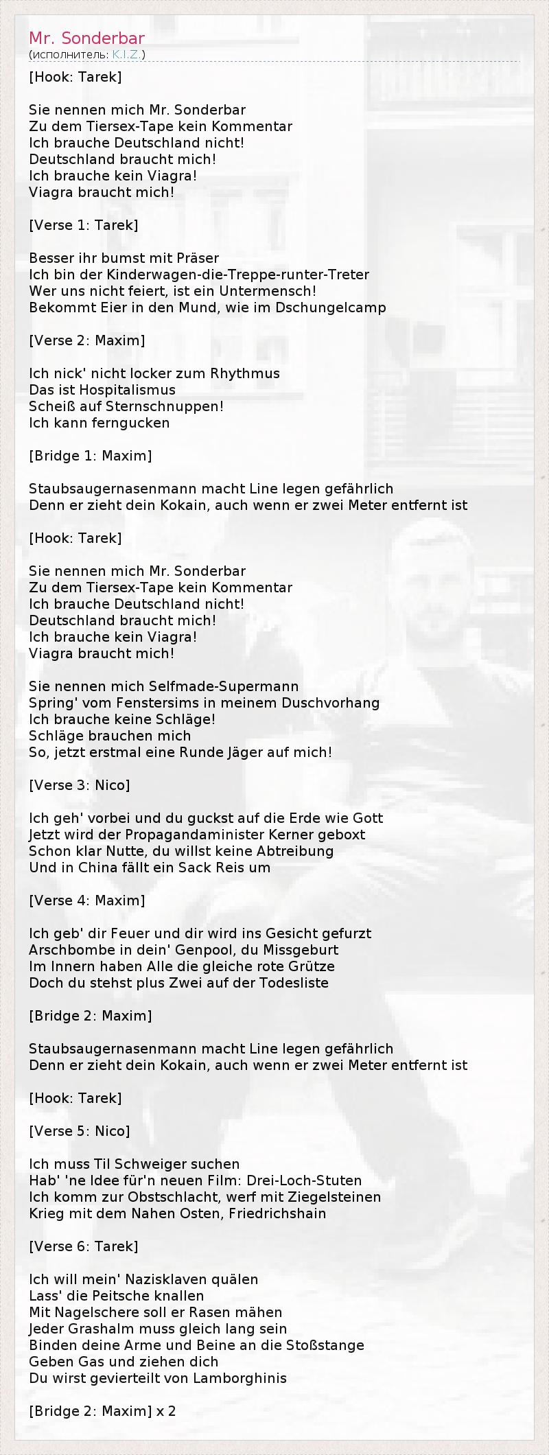 [Hook: Tarek] Sie nennen mich Mr. Sonderbar Zu dem Tiersex-Tape kein Kommentar Ich brauche Deutschland nicht! Deutschland braucht mich! Ich brauche kein Viagra! Viagra braucht mich! [Verse 1: Tarek] Besser ihr bumst mit Präser Ich bin der Kinderwagen-die-Treppe-runter-Treter Wer uns nicht feiert, ist ein Untermensch! Bekommt Eier in den Mund, wie im Dschungelcamp [Verse 2: Maxim] Ich nick' nicht locker zum Rhythmus Das ist Hospitalismus Scheiß auf Sternschnuppen! Ich kann ferngucken [Bridge 1: Maxim] Staubsaugernasenmann macht Line legen gefährlich Denn er zieht dein Kokain, auch wenn er zwei Meter entfernt ist [Hook: Tarek] Sie nennen mich Mr. Sonderbar Zu dem Tiersex-Tape kein Kommentar Ich brauche Deutschland nicht! Deutschland braucht mich! Ich brauche kein Viagra! Viagra braucht mich! Sie nennen mich Selfmade-Supermann Spring' vom Fenstersims in meinem Duschvorhang Ich brauche keine Schläge! Schläge brauchen mich So, jetzt erstmal eine Runde Jäger auf mich! [Verse 3: Nico] Ich geh' vorbei und du guckst auf die Erde wie Gott Jetzt wird der Propagandaminister Kerner geboxt Schon klar Nutte, du willst keine Abtreibung Und in China fällt ein Sack Reis um [Verse 4: Maxim] Ich geb' dir Feuer und dir wird ins Gesicht gefurzt Arschbombe in dein' Genpool, du Missgeburt Im Innern haben Alle die gleiche rote Grütze Doch du stehst plus Zwei auf der Todesliste [Bridge 2: Maxim] Staubsaugernasenmann macht Line legen gefährlich Denn er zieht dein Kokain, auch wenn er zwei Meter entfernt ist [Hook: Tarek] [Verse 5: Nico] Ich muss Til Schweiger suchen Hab' 'ne Idee für'n neuen Film: Drei-Loch-Stuten Ich komm zur Obstschlacht, werf mit Ziegelsteinen Krieg mit dem Nahen Osten, Friedrichshain [Verse 6: Tarek] Ich will mein' Nazisklaven quälen Lass' die Peitsche knallen Mit Nagelschere soll er Rasen mähen Jeder Grashalm muss gleich lang sein Binden deine Arme und Beine an die Stoßstange Geben Gas und ziehen dich Du wirst gevierteilt von Lamborghinis [Bridge 2: Maxim] x 2