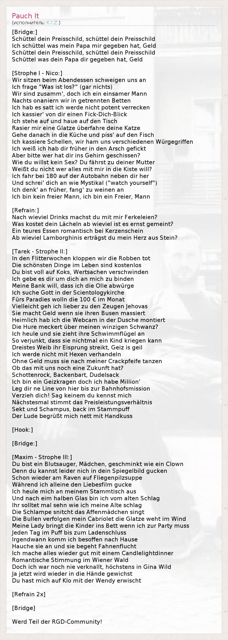Это интересно:K.I.Z. это немецкая хип-хоп команда из Берлина. K.I.Z., по их собственному мнению, создали новый стиль немецкой рэп музыки, называя его "смесью панка и техно". Это прежде всего рэп батлы, как правило, заполненые большим количеством иронии и черного юмора. Группа состоит из четырех человек: Тарек, Максим, Нико (так известный как € 8000) и DJ Craft.Имеется несколько версий рассшифровки аббревиатуры... продолжение