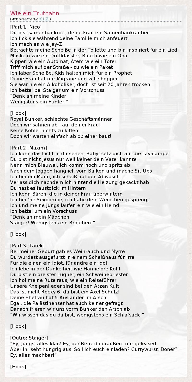 [Part 1: Nico] Du bist samenbankrott, deine Frau ein Samenbankräuber Ich fick sie während deine Familie mich anfeuert Ich mach es wie Jay-Z Betrachte meine Scheiße in der Toilette und bin inspiriert für ein Lied Muskeln wie ein Drittklässler, Bauch wie ein Opa Kippen wie ein Automat, Atem wie ein Toter Triff mich auf der Straße - zu wie ein Paket Ich laber Scheiße, Kids halten mich für ein Prophet Deine Frau hat nur Migräne und will shoppen Sie war nie ein Alkoholiker, doch ist seit 20 Jahren trocken Ich bettel bei Staiger um ein Vorschuss "Denk an meine Kinder Wenigstens ein Fünfer!" [Hook] Royal Bunker, schlechte Geschäftsmänner Doch wir sahnen ab - auf deiner Frau! Keine Kohle, nichts zu kiffen Doch wir warten einfach ab ob einer baut! [Part 2: Maxim] Ich kann das Licht in dir sehen, Baby, setz dich auf die Lavalampe Du bist nicht Jesus nur weil keiner dein Vater kannte Nenn mich Blauwal, ich komm hoch und spritz ab Nach dem Joggen häng ich vom Balkon und mache Sit-Ups Ich bin ein Mann, ich scheiß auf den Abwasch Verlass dich nachdem ich hinter die Heizung gekackt hab Du hast es faustdick im Hintern Ich kenn Bären, die in deiner Frau überwintern Ich bin ’ne Sexbombe, ich habe dein Weibchen gesprengt Ich und meine Jungs laufen ein wie ein Hemd Ich bettel um ein Vorschuss "Denk an mein Mädchen Staiger! Wenigstens ein Brötchen!" [Hook] [Part 3: Tarek] Bei meiner Geburt gab es Weihrauch und Myrre Du wurdest ausgefurzt in einem Scheißhaus für Irre Für die einen ein Idiot, für andre ein Idol Ich lebe in der Dunkelheit wie Hannelore Kohl Du bist ein dreister Lügner, ein Schweinepriester Ich hol meine Rute raus, wie ein Reiseführer Unsere Kneipenlieder sind bei den Atzen Kult Das ist nicht Rocky 6, du bist ein Axel Schulz! Deine Ehefrau hat 5 Ausländer im Arsch Egal, die Palästinenser hat auch keiner gefragt Danach frieren wir uns vorm Bunker den Arsch ab "Wir wissen das du da bist, wenigstens ein Schlafsack!" [Hook] [Outro: Staiger] "Ey, Jungs, alles klar? Ey, der Benz da draußen: nur geleased Aber ihr seht hungrig aus. Soll ich euch einladen? Currywurst, Döner? Ey, alles machbar!" [Hook]