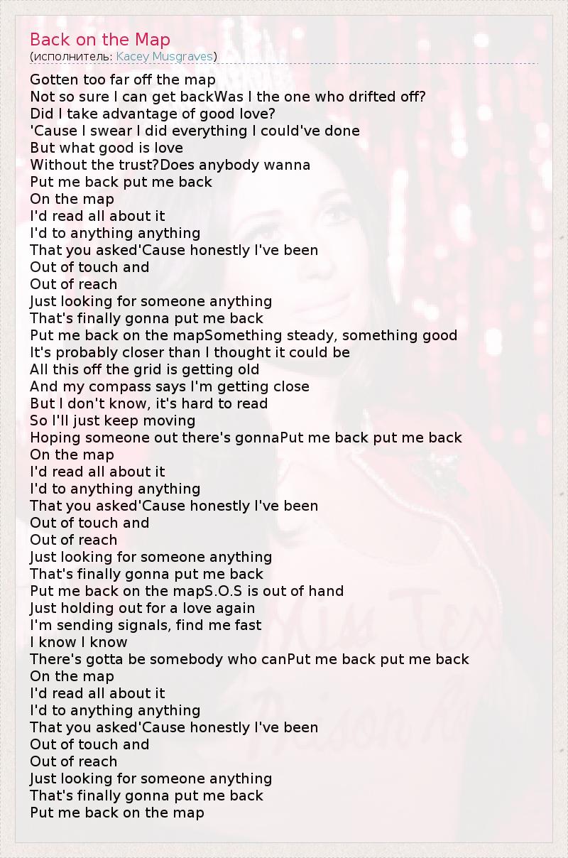 Gotten too far off the map Not so sure I can get backWas I the one who drifted off? Did I take advantage of good love? 'Cause I swear I did everything I could've done But what good is love Without the trust?Does anybody wanna Put me back put me back On the map I'd read all about it I'd to anything anything That you asked'Cause honestly I've been Out of touch and Out of reach Just looking for someone anything That's finally gonna put me back Put me back on the mapSomething steady, something good It's probably closer than I thought it could be All this off the grid is getting old And my compass says I'm getting close But I don't know, it's hard to read So I'll just keep moving Hoping someone out there's gonnaPut me back put me back On the map I'd read all about it I'd to anything anything That you asked'Cause honestly I've been Out of touch and Out of reach Just looking for someone anything That's finally gonna put me back Put me back on the mapS.O.S is out of hand Just holding out for a love again I'm sending signals, find me fast I know I know There's gotta be somebody who canPut me back put me back On the map I'd read all about it I'd to anything anything That you asked'Cause honestly I've been Out of touch and Out of reach Just looking for someone anything That's finally gonna put me back Put me back on the map