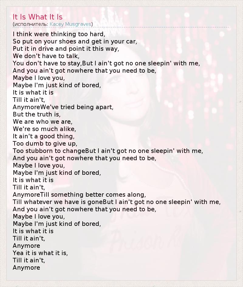 I think were thinking too hard, So put on your shoes and get in your car, Put it in drive and point it this way, We don't have to talk, You don't have to stay,But I ain't got no one sleepin' with me, And you ain't got nowhere that you need to be, Maybe I love you, Maybe I'm just kind of bored, It is what it is Till it ain't, AnymoreWe've tried being apart, But the truth is, We are who we are, We're so much alike, It ain't a good thing, Too dumb to give up, Too stubborn to changeBut I ain't got no one sleepin' with me, And you ain't got nowhere that you need to be, Maybe I love you, Maybe I'm just kind of bored, It is what it is Till it ain't, AnymoreTill something better comes along, Till whatever we have is goneBut I ain't got no one sleepin' with me, And you ain't got nowhere that you need to be, Maybe I love you, Maybe I'm just kind of bored, It is what it is Till it ain't, Anymore Yea it is what it is, Till it ain't, Anymore