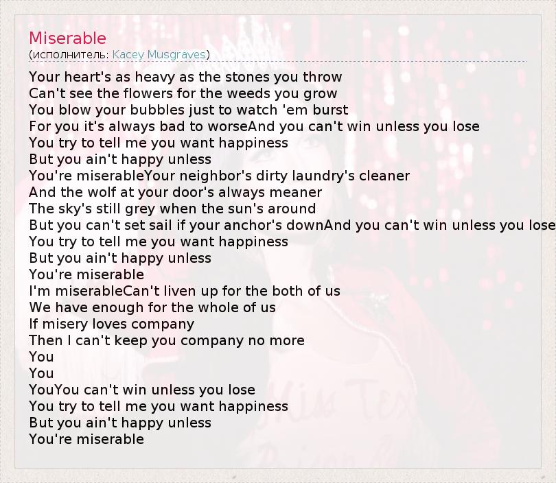 Your heart's as heavy as the stones you throw Can't see the flowers for the weeds you grow You blow your bubbles just to watch 'em burst For you it's always bad to worseAnd you can't win unless you lose You try to tell me you want happiness But you ain't happy unless You're miserableYour neighbor's dirty laundry's cleaner And the wolf at your door's always meaner The sky's still grey when the sun's around But you can't set sail if your anchor's downAnd you can't win unless you lose You try to tell me you want happiness But you ain't happy unless You're miserable I'm miserableCan't liven up for the both of us We have enough for the whole of us If misery loves company Then I can't keep you company no more You You YouYou can't win unless you lose You try to tell me you want happiness But you ain't happy unless You're miserable