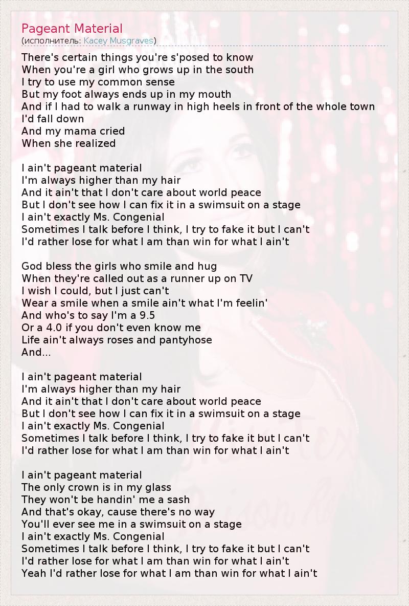 There's certain things you're s'posed to know When you're a girl who grows up in the south I try to use my common sense But my foot always ends up in my mouth And if I had to walk a runway in high heels in front of the whole town I'd fall down And my mama cried When she realized I ain't pageant material I'm always higher than my hair And it ain't that I don't care about world peace But I don't see how I can fix it in a swimsuit on a stage I ain't exactly Ms. Congenial Sometimes I talk before I think, I try to fake it but I can't I'd rather lose for what I am than win for what I ain't God bless the girls who smile and hug When they're called out as a runner up on TV I wish I could, but I just can't Wear a smile when a smile ain't what I'm feelin' And who's to say I'm a 9.5 Or a 4.0 if you don't even know me Life ain't always roses and pantyhose And... I ain't pageant material I'm always higher than my hair And it ain't that I don't care about world peace But I don't see how I can fix it in a swimsuit on a stage I ain't exactly Ms. Congenial Sometimes I talk before I think, I try to fake it but I can't I'd rather lose for what I am than win for what I ain't I ain't pageant material The only crown is in my glass They won't be handin' me a sash And that's okay, cause there's no way You'll ever see me in a swimsuit on a stage I ain't exactly Ms. Congenial Sometimes I talk before I think, I try to fake it but I can't I'd rather lose for what I am than win for what I ain't Yeah I'd rather lose for what I am than win for what I ain't