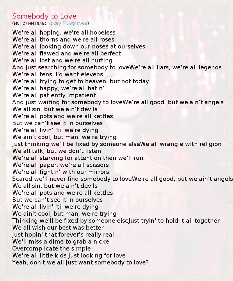 We're all hoping, we're all hopeless We're all thorns and we're all roses We're all looking down our noses at ourselves We're all flawed and we're all perfect We're all lost and we're all hurting And just searching for somebody to loveWe're all liars, we're all legends We're all tens, I'd want elevens We're all trying to get to heaven, but not today We're all happy, we're all hatin' We're all patiently impatient And just waiting for somebody to loveWe're all good, but we ain't angels We all sin, but we ain't devils We're all pots and we're all kettles But we can't see it in ourselves We're all livin' 'til we're dying We ain't cool, but man, we're trying Just thinking we'll be fixed by someone elseWe all wrangle with religion We all talk, but we don't listen We're all starving for attention then we'll run We're all paper, we're all scissors We're all fightin' with our mirrors Scared we'll never find somebody to loveWe're all good, but we ain't angels We all sin, but we ain't devils We're all pots and we're all kettles But we can't see it in ourselves We're all livin' 'til we're dying We ain't cool, but man, we're trying Thinking we'll be fixed by someone elseJust tryin' to hold it all together We all wish our best was better Just hopin' that forever's really real We'll miss a dime to grab a nickel Overcomplicate the simple We're all little kids just looking for love Yeah, don't we all just want somebody to love?