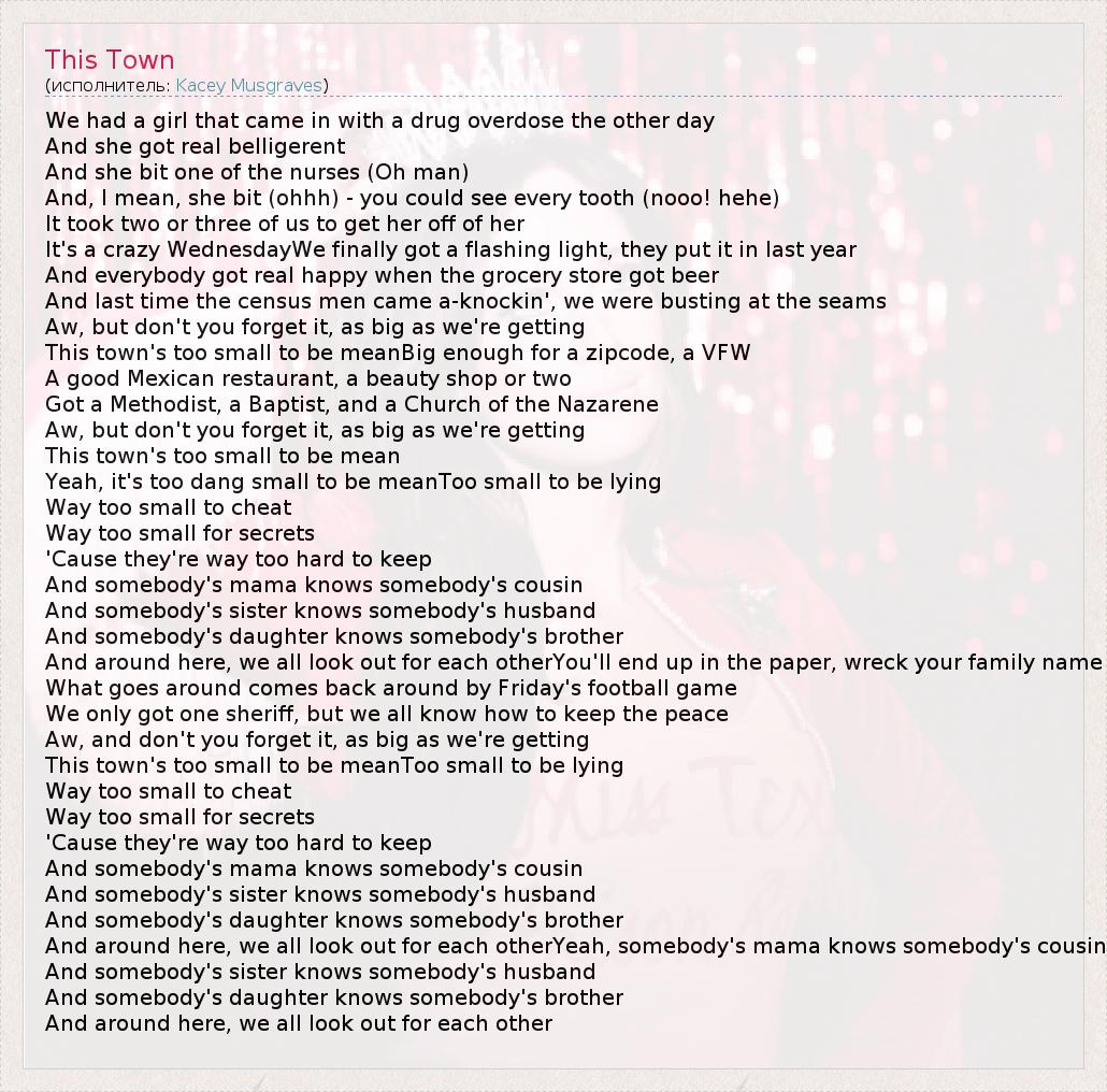 We had a girl that came in with a drug overdose the other day And she got real belligerent And she bit one of the nurses (Oh man) And, I mean, she bit (ohhh) - you could see every tooth (nooo! hehe) It took two or three of us to get her off of her It's a crazy WednesdayWe finally got a flashing light, they put it in last year And everybody got real happy when the grocery store got beer And last time the census men came a-knockin', we were busting at the seams Aw, but don't you forget it, as big as we're getting This town's too small to be meanBig enough for a zipcode, a VFW A good Mexican restaurant, a beauty shop or two Got a Methodist, a Baptist, and a Church of the Nazarene Aw, but don't you forget it, as big as we're getting This town's too small to be mean Yeah, it's too dang small to be meanToo small to be lying Way too small to cheat Way too small for secrets 'Cause they're way too hard to keep And somebody's mama knows somebody's cousin And somebody's sister knows somebody's husband And somebody's daughter knows somebody's brother And around here, we all look out for each otherYou'll end up in the paper, wreck your family name What goes around comes back around by Friday's football game We only got one sheriff, but we all know how to keep the peace Aw, and don't you forget it, as big as we're getting This town's too small to be meanToo small to be lying Way too small to cheat Way too small for secrets 'Cause they're way too hard to keep And somebody's mama knows somebody's cousin And somebody's sister knows somebody's husband And somebody's daughter knows somebody's brother And around here, we all look out for each otherYeah, somebody's mama knows somebody's cousin And somebody's sister knows somebody's husband And somebody's daughter knows somebody's brother And around here, we all look out for each other