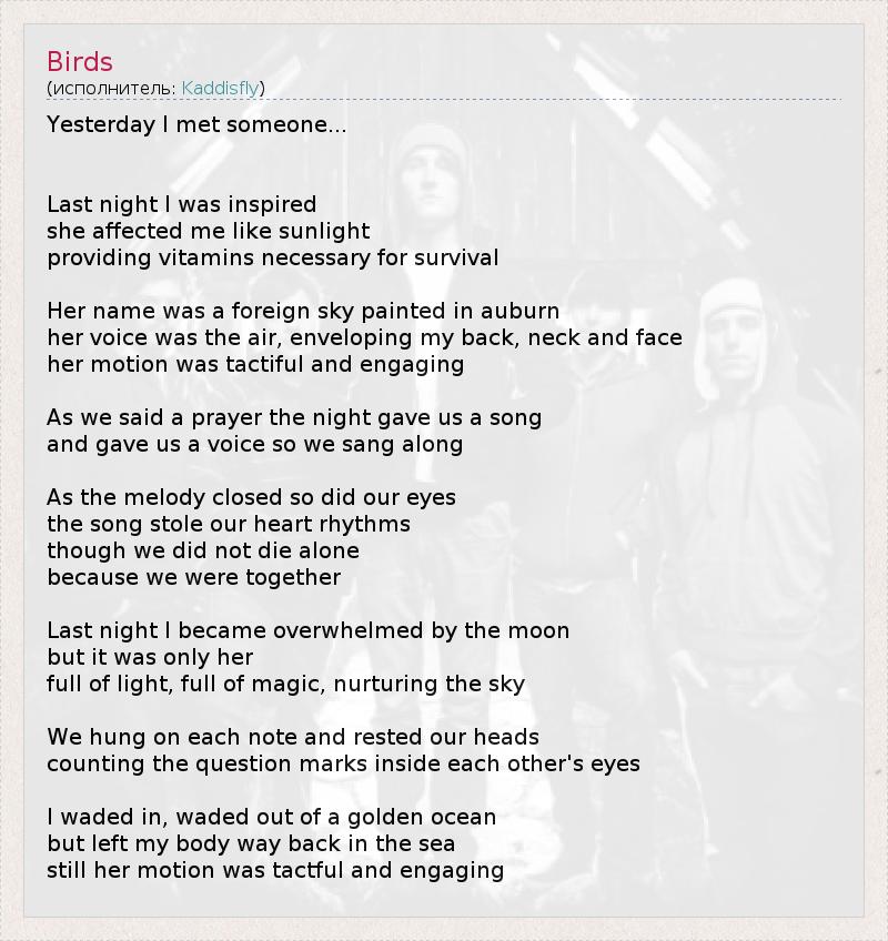 Yesterday I met someone... Last night I was inspired she affected me like sunlight providing vitamins necessary for survival Her name was a foreign sky painted in auburn her voice was the air, enveloping my back, neck and face her motion was tactiful and engaging As we said a prayer the night gave us a song and gave us a voice so we sang along As the melody closed so did our eyes the song stole our heart rhythms though we did not die alone because we were together Last night I became overwhelmed by the moon but it was only her full of light, full of magic, nurturing the sky We hung on each note and rested our heads counting the question marks inside each other's eyes I waded in, waded out of a golden ocean but left my body way back in the sea still her motion was tactful and engaging