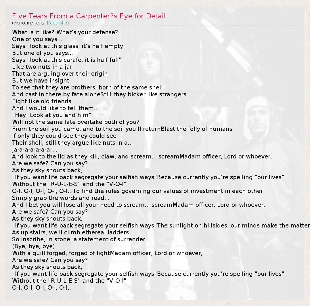 А как ты думаешь, о чем песня "Five Tears From a Carpenter?s Eye for Detail" ?