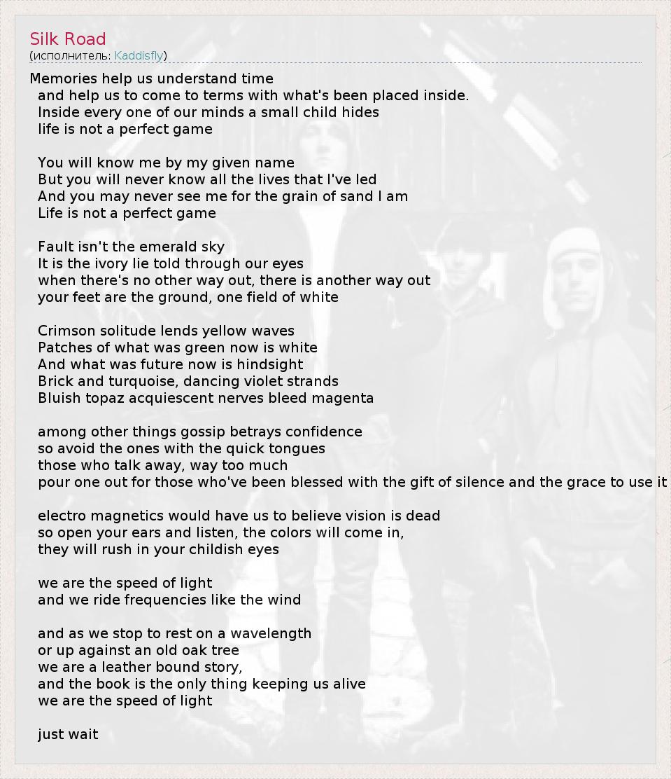 Memories help us understand time and help us to come to terms with what's been placed inside. Inside every one of our minds a small child hides life is not a perfect game You will know me by my given name But you will never know all the lives that I've led And you may never see me for the grain of sand I am Life is not a perfect game Fault isn't the emerald sky It is the ivory lie told through our eyes when there's no other way out, there is another way out your feet are the ground, one field of white Crimson solitude lends yellow waves Patches of what was green now is white And what was future now is hindsight Brick and turquoise, dancing violet strands Bluish topaz acquiescent nerves bleed magenta among other things gossip betrays confidence so avoid the ones with the quick tongues those who talk away, way too much pour one out for those who've been blessed with the gift of silence and the grace to use it electro magnetics would have us to believe vision is dead so open your ears and listen, the colors will come in, they will rush in your childish eyes we are the speed of light and we ride frequencies like the wind and as we stop to rest on a wavelength or up against an old oak tree we are a leather bound story, and the book is the only thing keeping us alive we are the speed of light just wait