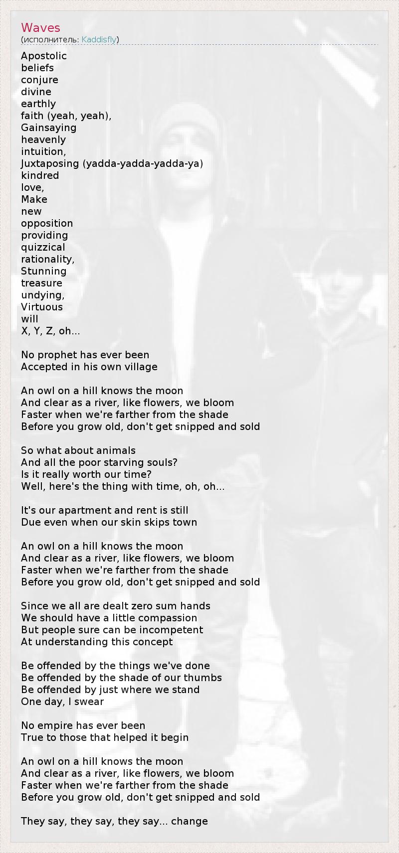 Apostolic beliefs conjure divine earthly faith (yeah, yeah), Gainsaying heavenly intuition, Juxtaposing (yadda-yadda-yadda-ya) kindred love, Make new opposition providing quizzical rationality, Stunning treasure undying, Virtuous will X, Y, Z, oh... No prophet has ever been Accepted in his own village An owl on a hill knows the moon And clear as a river, like flowers, we bloom Faster when we're farther from the shade Before you grow old, don't get snipped and sold So what about animals And all the poor starving souls? Is it really worth our time? Well, here's the thing with time, oh, oh... It's our apartment and rent is still Due even when our skin skips town An owl on a hill knows the moon And clear as a river, like flowers, we bloom Faster when we're farther from the shade Before you grow old, don't get snipped and sold Since we all are dealt zero sum hands We should have a little compassion But people sure can be incompetent At understanding this concept Be offended by the things we've done Be offended by the shade of our thumbs Be offended by just where we stand One day, I swear No empire has ever been True to those that helped it begin An owl on a hill knows the moon And clear as a river, like flowers, we bloom Faster when we're farther from the shade Before you grow old, don't get snipped and sold They say, they say, they say... change