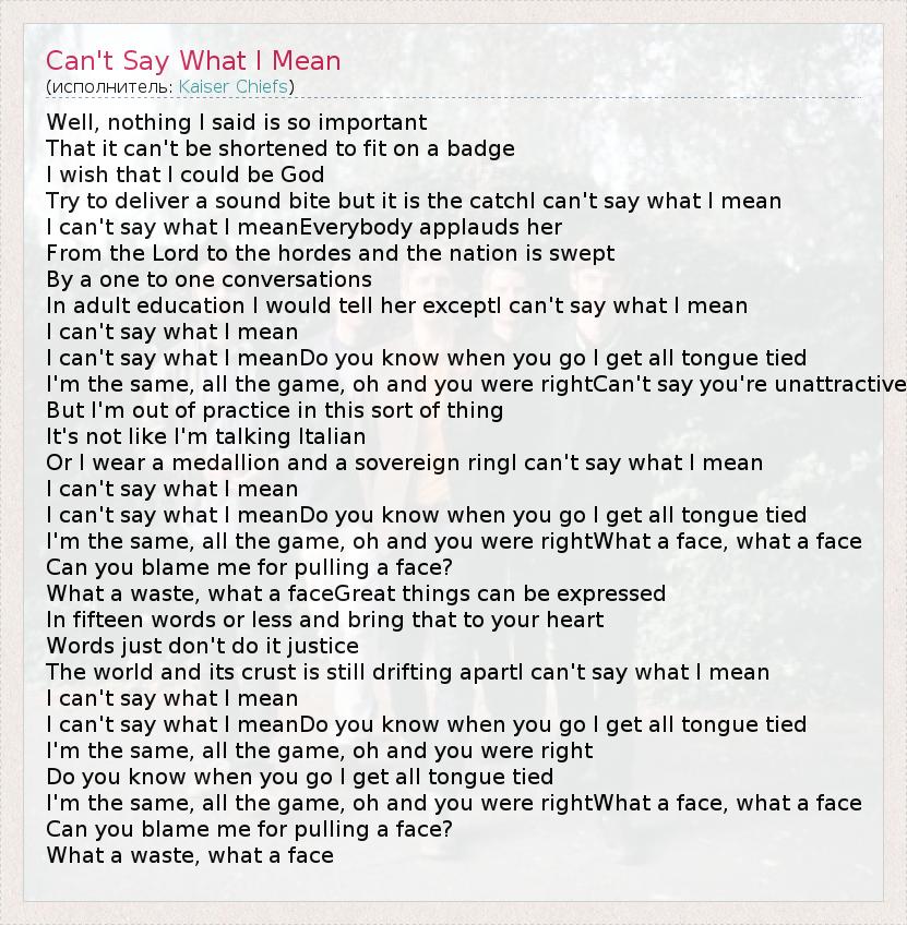 Well, nothing I said is so important That it can't be shortened to fit on a badge I wish that I could be God Try to deliver a sound bite but it is the catchI can't say what I mean I can't say what I meanEverybody applauds her From the Lord to the hordes and the nation is swept By a one to one conversations In adult education I would tell her exceptI can't say what I mean I can't say what I mean I can't say what I meanDo you know when you go I get all tongue tied I'm the same, all the game, oh and you were rightCan't say you're unattractive But I'm out of practice in this sort of thing It's not like I'm talking Italian Or I wear a medallion and a sovereign ringI can't say what I mean I can't say what I mean I can't say what I meanDo you know when you go I get all tongue tied I'm the same, all the game, oh and you were rightWhat a face, what a face Can you blame me for pulling a face? What a waste, what a faceGreat things can be expressed In fifteen words or less and bring that to your heart Words just don't do it justice The world and its crust is still drifting apartI can't say what I mean I can't say what I mean I can't say what I meanDo you know when you go I get all tongue tied I'm the same, all the game, oh and you were right Do you know when you go I get all tongue tied I'm the same, all the game, oh and you were rightWhat a face, what a face Can you blame me for pulling a face? What a waste, what a face