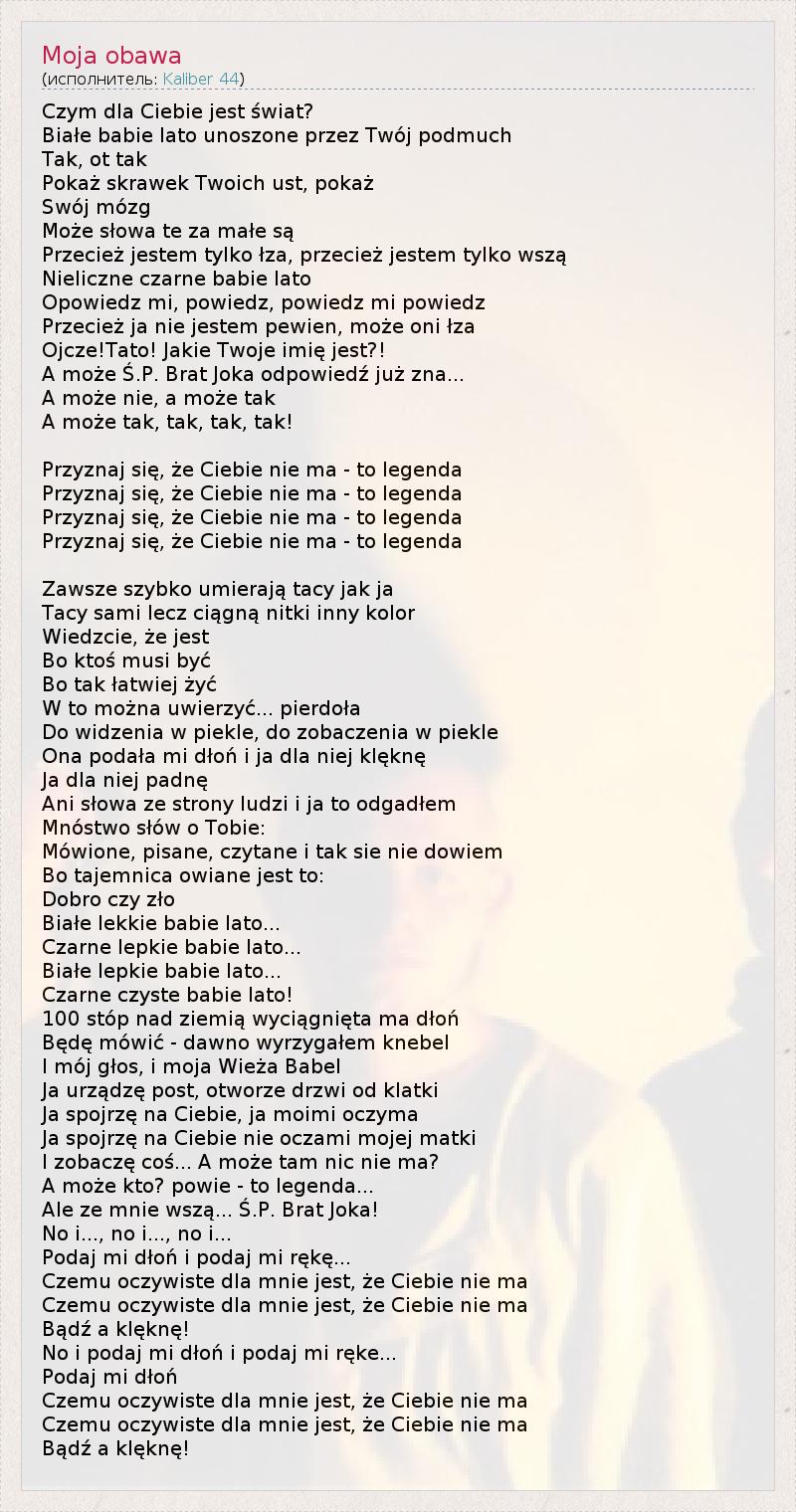 Czym dla Ciebie jest świat? Białe babie lato unoszone przez Twój podmuch Tak, ot tak Pokaż skrawek Twoich ust, pokaż Swój mózg Może słowa te za małe są Przecież jestem tylko łza, przecież jestem tylko wszą Nieliczne czarne babie lato Opowiedz mi, powiedz, powiedz mi powiedz Przecież ja nie jestem pewien, może oni łza Ojcze!Tato! Jakie Twoje imię jest?! A może Ś.P. Brat Joka odpowiedź już zna... A może nie, a może tak A może tak, tak, tak, tak! Przyznaj się, że Ciebie nie ma - to legenda Przyznaj się, że Ciebie nie ma - to legenda Przyznaj się, że Ciebie nie ma - to legenda Przyznaj się, że Ciebie nie ma - to legenda Zawsze szybko umierają tacy jak ja Tacy sami lecz ciągną nitki inny kolor Wiedzcie, że jest Bo ktoś musi być Bo tak łatwiej żyć W to można uwierzyć... pierdoła Do widzenia w piekle, do zobaczenia w piekle Ona podała mi dłoń i ja dla niej klęknę Ja dla niej padnę Ani słowa ze strony ludzi i ja to odgadłem Mnóstwo słów o Tobie: Mówione, pisane, czytane i tak sie nie dowiem Bo tajemnica owiane jest to: Dobro czy zło Białe lekkie babie lato... Czarne lepkie babie lato... Białe lepkie babie lato... Czarne czyste babie lato! 100 stóp nad ziemią wyciągnięta ma dłoń Będę mówić - dawno wyrzygałem knebel I mój głos, i moja Wieża Babel Ja urządzę post, otworze drzwi od klatki Ja spojrzę na Ciebie, ja moimi oczyma Ja spojrzę na Ciebie nie oczami mojej matki I zobaczę coś... A może tam nic nie ma? A może kto? powie - to legenda... Ale ze mnie wszą... Ś.P. Brat Joka! No i..., no i..., no i... Podaj mi dłoń i podaj mi rękę... Czemu oczywiste dla mnie jest, że Ciebie nie ma Czemu oczywiste dla mnie jest, że Ciebie nie ma Bądź a klęknę! No i podaj mi dłoń i podaj mi ręke... Podaj mi dłoń Czemu oczywiste dla mnie jest, że Ciebie nie ma Czemu oczywiste dla mnie jest, że Ciebie nie ma Bądź a klęknę!