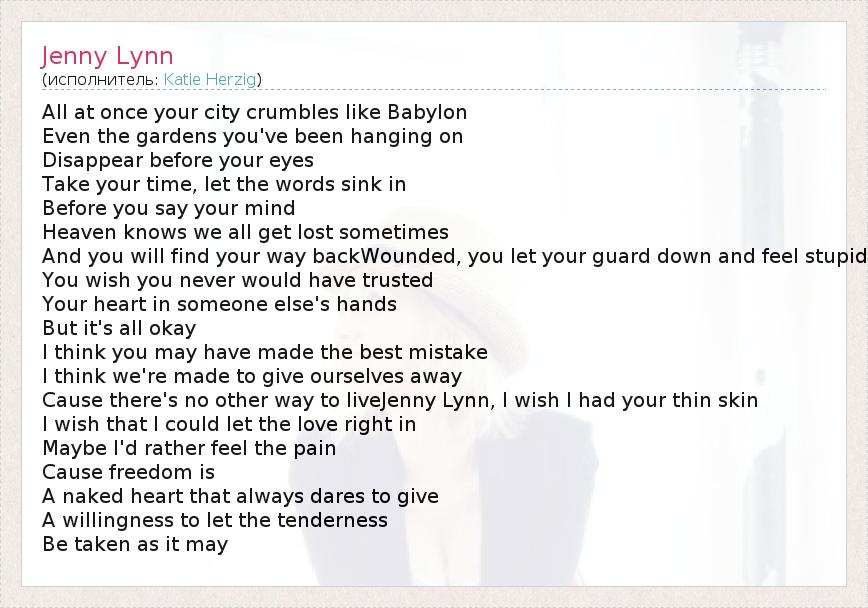 All at once your city crumbles like Babylon Even the gardens you've been hanging on Disappear before your eyes Take your time, let the words sink in Before you say your mind Heaven knows we all get lost sometimes And you will find your way backWounded, you let your guard down and feel stupid You wish you never would have trusted Your heart in someone else's hands But it's all okay I think you may have made the best mistake I think we're made to give ourselves away Cause there's no other way to liveJenny Lynn, I wish I had your thin skin I wish that I could let the love right in Maybe I'd rather feel the pain Cause freedom is A naked heart that always dares to give A willingness to let the tenderness Be taken as it may