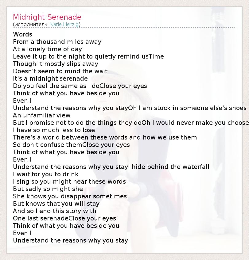 Words From a thousand miles away At a lonely time of day Leave it up to the night to quietly remind usTime Though it mostly slips away Doesn't seem to mind the wait It's a midnight serenade Do you feel the same as I doClose your eyes Think of what you have beside you Even I Understand the reasons why you stayOh I am stuck in someone else's shoes An unfamiliar view But I promise not to do the things they doOh I would never make you choose I have so much less to lose There's a world between these words and how we use them So don't confuse themClose your eyes Think of what you have beside you Even I Understand the reasons why you stayI hide behind the waterfall I wait for you to drink I sing so you might hear these words But sadly so might she She knows you disappear sometimes But knows that you will stay And so I end this story with One last serenadeClose your eyes Think of what you have beside you Even I Understand the reasons why you stay