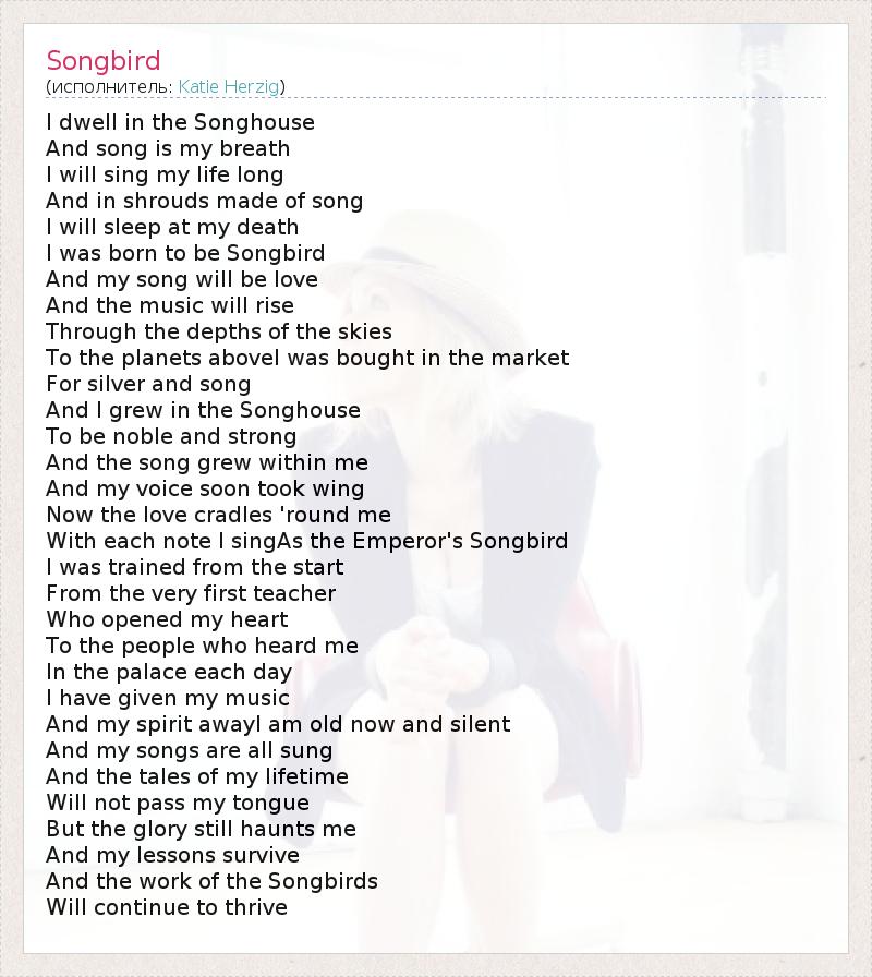 I dwell in the Songhouse And song is my breath I will sing my life long And in shrouds made of song I will sleep at my death I was born to be Songbird And my song will be love And the music will rise Through the depths of the skies To the planets aboveI was bought in the market For silver and song And I grew in the Songhouse To be noble and strong And the song grew within me And my voice soon took wing Now the love cradles 'round me With each note I singAs the Emperor's Songbird I was trained from the start From the very first teacher Who opened my heart To the people who heard me In the palace each day I have given my music And my spirit awayI am old now and silent And my songs are all sung And the tales of my lifetime Will not pass my tongue But the glory still haunts me And my lessons survive And the work of the Songbirds Will continue to thrive