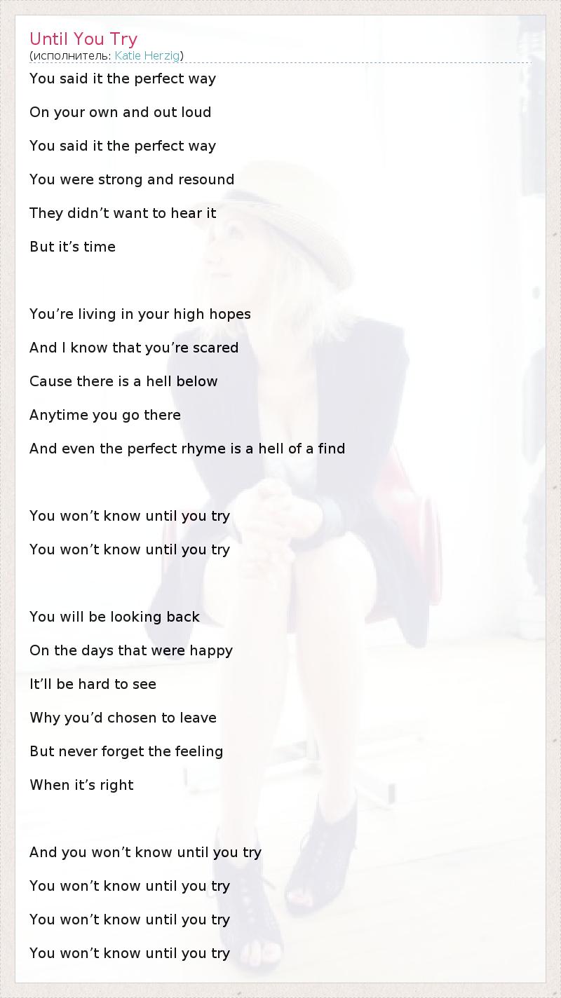 You said it the perfect way On your own and out loud You said it the perfect way You were strong and resound They didn’t want to hear it But it’s time You’re living in your high hopes And I know that you’re scared Cause there is a hell below Anytime you go there And even the perfect rhyme is a hell of a find You won’t know until you try You won’t know until you try You will be looking back On the days that were happy It’ll be hard to see Why you’d chosen to leave But never forget the feeling When it’s right And you won’t know until you try You won’t know until you try You won’t know until you try You won’t know until you try