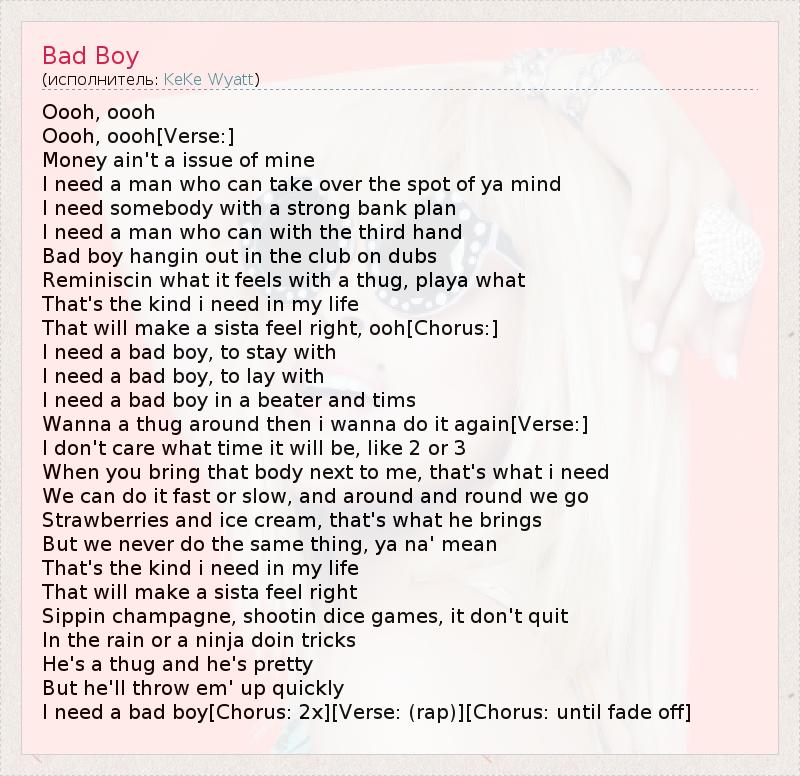 Oooh, oooh Oooh, oooh[Verse:] Money ain't a issue of mine I need a man who can take over the spot of ya mind I need somebody with a strong bank plan I need a man who can with the third hand Bad boy hangin out in the club on dubs Reminiscin what it feels with a thug, playa what That's the kind i need in my life That will make a sista feel right, ooh[Chorus:] I need a bad boy, to stay with I need a bad boy, to lay with I need a bad boy in a beater and tims Wanna a thug around then i wanna do it again[Verse:] I don't care what time it will be, like 2 or 3 When you bring that body next to me, that's what i need We can do it fast or slow, and around and round we go Strawberries and ice cream, that's what he brings But we never do the same thing, ya na' mean That's the kind i need in my life That will make a sista feel right Sippin champagne, shootin dice games, it don't quit In the rain or a ninja doin tricks He's a thug and he's pretty But he'll throw em' up quickly I need a bad boy[Chorus: 2x][Verse: (rap)][Chorus: until fade off]
