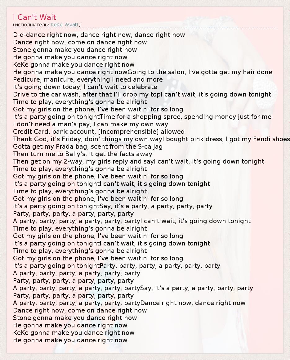D-d-dance right now, dance right now, dance right now Dance right now, come on dance right now Stone gonna make you dance right now He gonna make you dance right now KeKe gonna make you dance right now He gonna make you dance right nowGoing to the salon, I've gotta get my hair done Pedicure, manicure, everything I need and more It's going down today, I can't wait to celebrate Drive to the car wash, after that I'll drop my topI can't wait, it's going down tonight Time to play, everything's gonna be alright Got my girls on the phone, I've been waitin' for so long It's a party going on tonightTime for a shopping spree, spending money just for me I don't need a man's pay, I can make my own way Credit Card, bank account, [Incomprehensible] allowed Thank God, it's Friday, doin' things my own wayI bought pink dress, I got my Fendi shoes Gotta get my Prada bag, scent from the S-ca jag Then turn me to Bally's, it get the facts away Then get on my 2-way, my girls reply and sayI can't wait, it's going down tonight Time to play, everything's gonna be alright Got my girls on the phone, I've been waitin' for so long It's a party going on tonightI can't wait, it's going down tonight Time to play, everything's gonna be alright Got my girls on the phone, I've been waitin' for so long It's a party going on tonightSay, it's a party, a party, party, party Party, party, party, a party, party, party A party, party, party, a party, party, partyI can't wait, it's going down tonight Time to play, everything's gonna be alright Got my girls on the phone, I've been waitin' for so long It's a party going on tonightI can't wait, it's going down tonight Time to play, everything's gonna be alright Got my girls on the phone, I've been waitin' for so long It's a party going on tonightParty, party, party, a party, party, party A party, party, party, a party, party, party Party, party, party, a party, party, party A party, party, party, a party, party, partySay, it's a party, a party, party, party Party, party, party, a party, party, party A party, party, party, a party, party, partyDance right now, dance right now Dance right now, come on dance right now Stone gonna make you dance right now He gonna make you dance right now KeKe gonna make you dance right now He gonna make you dance right now