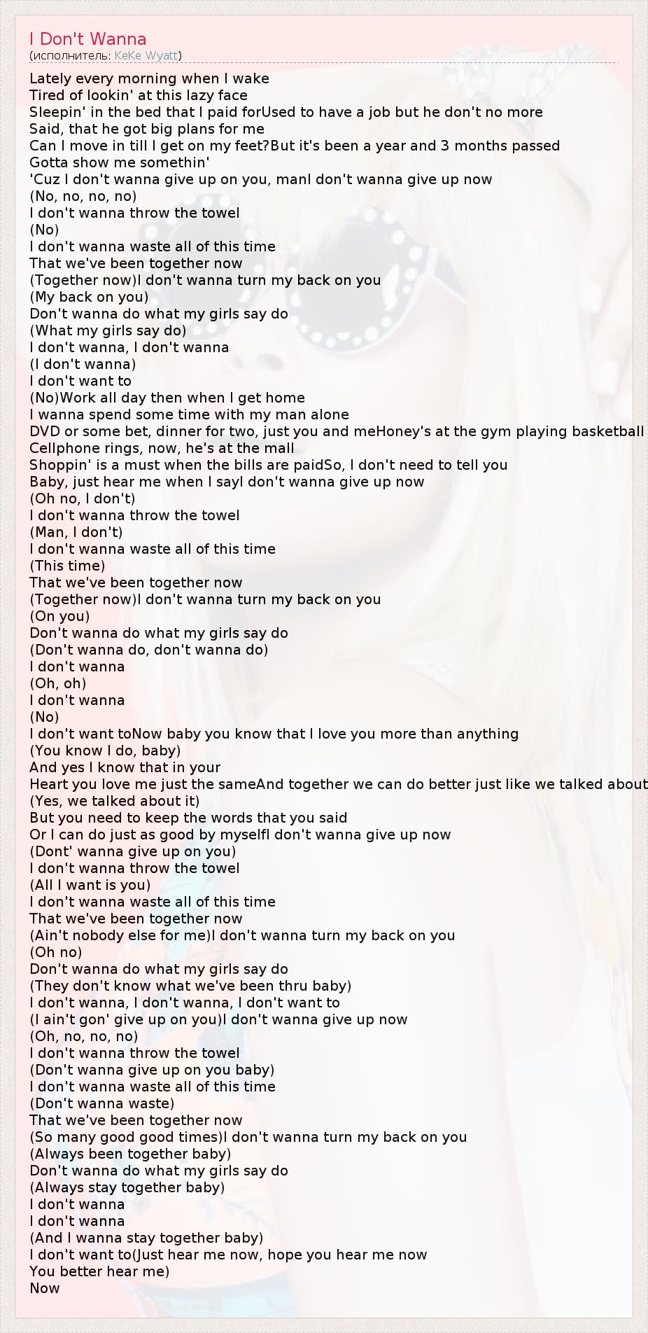 Lately every morning when I wake Tired of lookin' at this lazy face Sleepin' in the bed that I paid forUsed to have a job but he don't no more Said, that he got big plans for me Can I move in till I get on my feet?But it's been a year and 3 months passed Gotta show me somethin' 'Cuz I don't wanna give up on you, manI don't wanna give up now (No, no, no, no) I don't wanna throw the towel (No) I don't wanna waste all of this time That we've been together now (Together now)I don't wanna turn my back on you (My back on you) Don't wanna do what my girls say do (What my girls say do) I don't wanna, I don't wanna (I don't wanna) I don't want to (No)Work all day then when I get home I wanna spend some time with my man alone DVD or some bet, dinner for two, just you and meHoney's at the gym playing basketball Cellphone rings, now, he's at the mall Shoppin' is a must when the bills are paidSo, I don't need to tell you Baby, just hear me when I sayI don't wanna give up now (Oh no, I don't) I don't wanna throw the towel (Man, I don't) I don't wanna waste all of this time (This time) That we've been together now (Together now)I don't wanna turn my back on you (On you) Don't wanna do what my girls say do (Don't wanna do, don't wanna do) I don't wanna (Oh, oh) I don't wanna (No) I don't want toNow baby you know that I love you more than anything (You know I do, baby) And yes I know that in your Heart you love me just the sameAnd together we can do better just like we talked about (Yes, we talked about it) But you need to keep the words that you said Or I can do just as good by myselfI don't wanna give up now (Dont' wanna give up on you) I don't wanna throw the towel (All I want is you) I don't wanna waste all of this time That we've been together now (Ain't nobody else for me)I don't wanna turn my back on you (Oh no) Don't wanna do what my girls say do (They don't know what we've been thru baby) I don't wanna, I don't wanna, I don't want to (I ain't gon' give up on you)I don't wanna give up now (Oh, no, no, no) I don't wanna throw the towel (Don't wanna give up on you baby) I don't wanna waste all of this time (Don't wanna waste) That we've been together now (So many good good times)I don't wanna turn my back on you (Always been together baby) Don't wanna do what my girls say do (Always stay together baby) I don't wanna I don't wanna (And I wanna stay together baby) I don't want to(Just hear me now, hope you hear me now You better hear me) Now