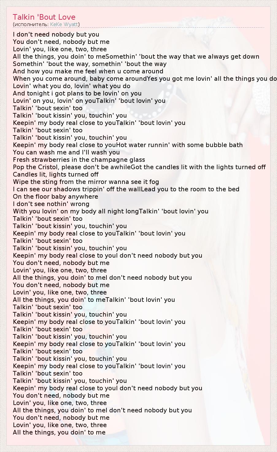 I don't need nobody but you You don't need, nobody but me Lovin' you, like one, two, three All the things, you doin' to meSomethin' 'bout the way that we always get down Somethin' 'bout the way, somethin' 'bout the way And how you make me feel when u come around When you come around, baby come aroundYes you got me lovin' all the things you do Lovin' what you do, lovin' what you do And tonight i got plans to be lovin' on you Lovin' on you, lovin' on youTalkin' 'bout lovin' you Talkin' 'bout sexin' too Talkin' 'bout kissin' you, touchin' you Keepin' my body real close to youTalkin' 'bout lovin' you Talkin' 'bout sexin' too Talkin' 'bout kissin' you, touchin' you Keepin' my body real close to youHot water runnin' with some bubble bath You can wash me and I'll wash you Fresh strawberries in the champagne glass Pop the Cristol, please don't be awhileGot the candles lit with the lights turned off Candles lit, lights turned off Wipe the sting from the mirror wanna see it fog I can see our shadows trippin' off the wallLead you to the room to the bed On the floor baby anywhere I don't see nothin' wrong With you lovin' on my body all night longTalkin' 'bout lovin' you Talkin' 'bout sexin' too Talkin' 'bout kissin' you, touchin' you Keepin' my body real close to youTalkin' 'bout lovin' you Talkin' 'bout sexin' too Talkin' 'bout kissin' you, touchin' you Keepin' my body real close to youI don't need nobody but you You don't need, nobody but me Lovin' you, like one, two, three All the things, you doin' to meI don't need nobody but you You don't need, nobody but me Lovin' you, like one, two, three All the things, you doin' to meTalkin' 'bout lovin' you Talkin' 'bout sexin' too Talkin' 'bout kissin' you, touchin' you Keepin' my body real close to youTalkin' 'bout lovin' you Talkin' 'bout sexin' too Talkin' 'bout kissin' you, touchin' you Keepin' my body real close to youTalkin' 'bout lovin' you Talkin' 'bout sexin' too Talkin' 'bout kissin' you, touchin' you Keepin' my body real close to youTalkin' 'bout lovin' you Talkin' 'bout sexin' too Talkin' 'bout kissin' you, touchin' you Keepin' my body real close to youI don't need nobody but you You don't need, nobody but me Lovin' you, like one, two, three All the things, you doin' to meI don't need nobody but you You don't need, nobody but me Lovin' you, like one, two, three All the things, you doin' to me