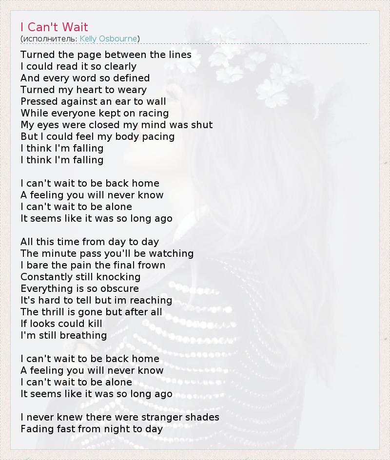 Turned the page between the lines I could read it so clearly And every word so defined Turned my heart to weary Pressed against an ear to wall While everyone kept on racing My eyes were closed my mind was shut But I could feel my body pacing I think I'm falling I think I'm falling I can't wait to be back home A feeling you will never know I can't wait to be alone It seems like it was so long ago All this time from day to day The minute pass you'll be watching I bare the pain the final frown Constantly still knocking Everything is so obscure It's hard to tell but im reaching The thrill is gone but after all If looks could kill I'm still breathing I can't wait to be back home A feeling you will never know I can't wait to be alone It seems like it was so long ago I never knew there were stranger shades Fading fast from night to day