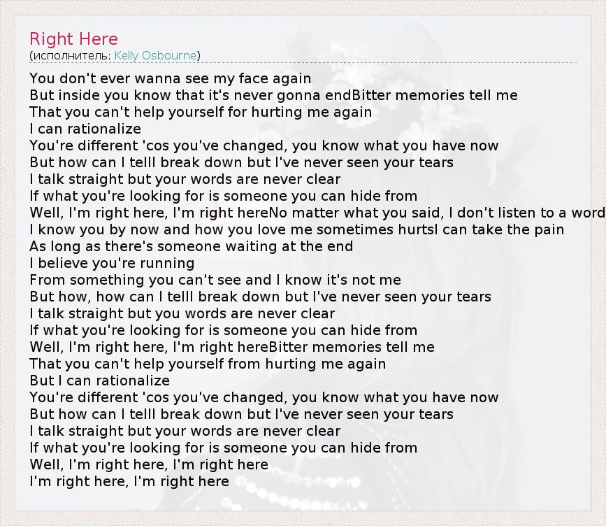 You don't ever wanna see my face again But inside you know that it's never gonna endBitter memories tell me That you can't help yourself for hurting me again I can rationalize You're different 'cos you've changed, you know what you have now But how can I tellI break down but I've never seen your tears I talk straight but your words are never clear If what you're looking for is someone you can hide from Well, I'm right here, I'm right hereNo matter what you said, I don't listen to a word I know you by now and how you love me sometimes hurtsI can take the pain As long as there's someone waiting at the end I believe you're running From something you can't see and I know it's not me But how, how can I tellI break down but I've never seen your tears I talk straight but you words are never clear If what you're looking for is someone you can hide from Well, I'm right here, I'm right hereBitter memories tell me That you can't help yourself from hurting me again But I can rationalize You're different 'cos you've changed, you know what you have now But how can I tellI break down but I've never seen your tears I talk straight but your words are never clear If what you're looking for is someone you can hide from Well, I'm right here, I'm right here I'm right here, I'm right here