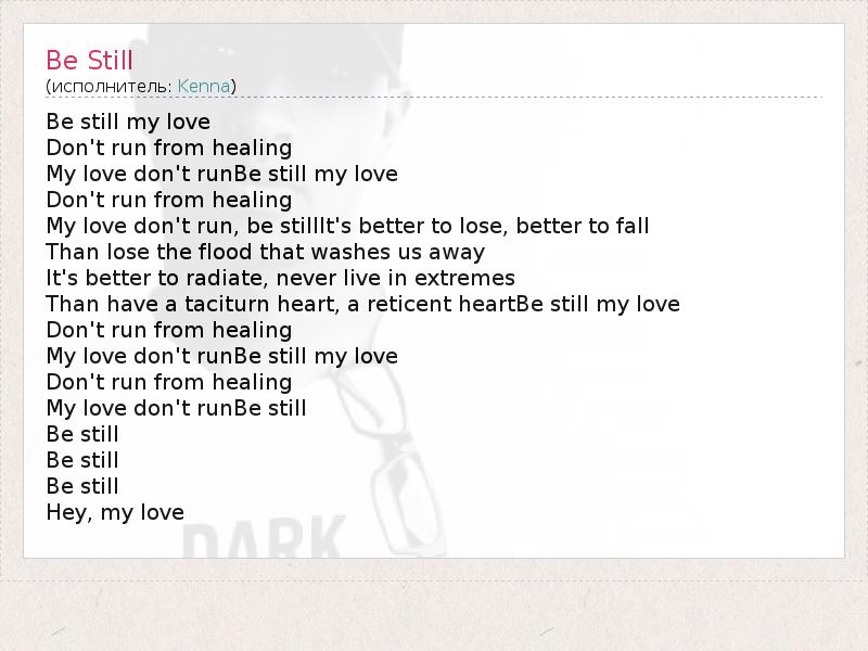 Be still my love Don't run from healing My love don't runBe still my love Don't run from healing My love don't run, be stillIt's better to lose, better to fall Than lose the flood that washes us away It's better to radiate, never live in extremes Than have a taciturn heart, a reticent heartBe still my love Don't run from healing My love don't runBe still my love Don't run from healing My love don't runBe still Be still Be still Be still Hey, my love