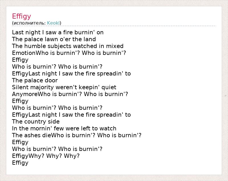 Last night I saw a fire burnin' on The palace lawn o'er the land The humble subjects watched in mixed EmotionWho is burnin'? Who is burnin'? Effigy Who is burnin'? Who is burnin'? EffigyLast night I saw the fire spreadin' to The palace door Silent majority weren't keepin' quiet AnymoreWho is burnin'? Who is burnin'? Effigy Who is burnin'? Who is burnin'? EffigyLast night I saw the fire spreadin' to The country side In the mornin' few were left to watch The ashes dieWho is burnin'? Who is burnin'? Effigy Who is burnin'? Who is burnin'? EffigyWhy? Why? Why? Effigy