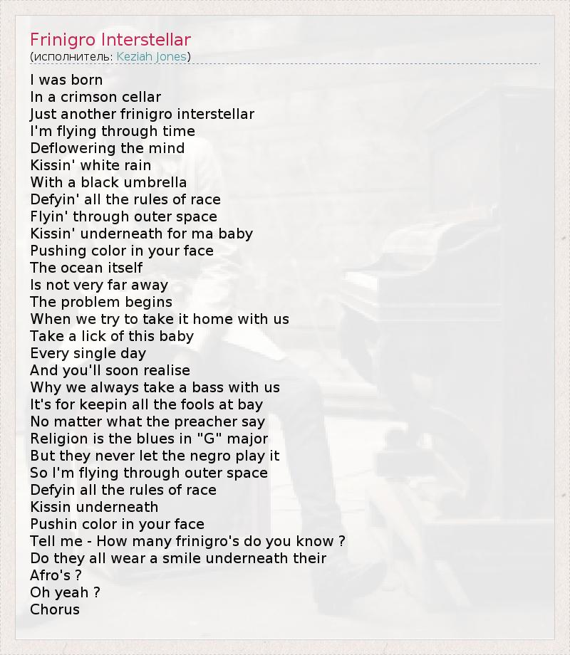 I was born In a crimson cellar Just another frinigro interstellar I'm flying through time Deflowering the mind Kissin' white rain With a black umbrella Defyin' all the rules of race Flyin' through outer space Kissin' underneath for ma baby Pushing color in your face The ocean itself Is not very far away The problem begins When we try to take it home with us Take a lick of this baby Every single day And you'll soon realise Why we always take a bass with us It's for keepin all the fools at bay No matter what the preacher say Religion is the blues in "G" major But they never let the negro play it So I'm flying through outer space Defyin all the rules of race Kissin underneath Pushin color in your face Tell me - How many frinigro's do you know ? Do they all wear a smile underneath their Afro's ? Oh yeah ? Chorus
