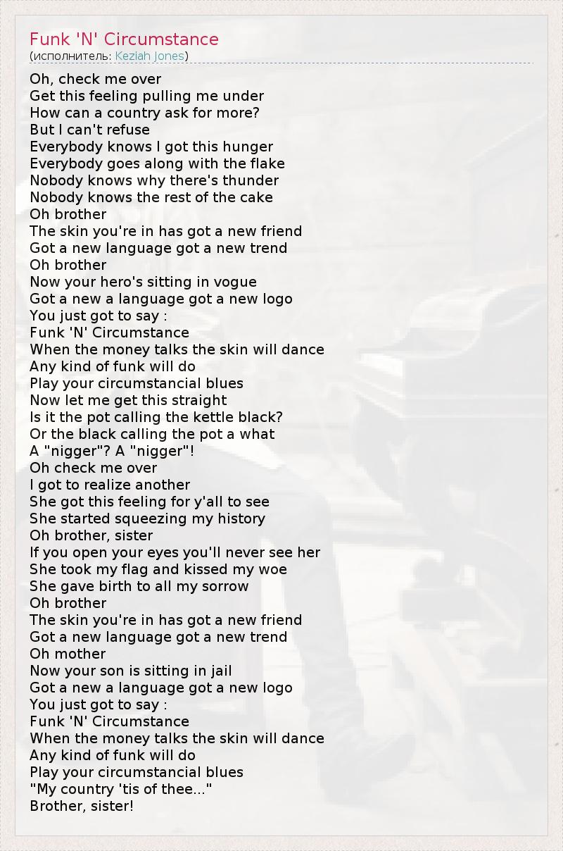 Oh, check me over Get this feeling pulling me under How can a country ask for more? But I can't refuse Everybody knows I got this hunger Everybody goes along with the flake Nobody knows why there's thunder Nobody knows the rest of the cake Oh brother The skin you're in has got a new friend Got a new language got a new trend Oh brother Now your hero's sitting in vogue Got a new a language got a new logo You just got to say : Funk 'N' Circumstance When the money talks the skin will dance Any kind of funk will do Play your circumstancial blues Now let me get this straight Is it the pot calling the kettle black? Or the black calling the pot a what A "nigger"? A "nigger"! Oh check me over I got to realize another She got this feeling for y'all to see She started squeezing my history Oh brother, sister If you open your eyes you'll never see her She took my flag and kissed my woe She gave birth to all my sorrow Oh brother The skin you're in has got a new friend Got a new language got a new trend Oh mother Now your son is sitting in jail Got a new a language got a new logo You just got to say : Funk 'N' Circumstance When the money talks the skin will dance Any kind of funk will do Play your circumstancial blues "My country 'tis of thee..." Brother, sister!
